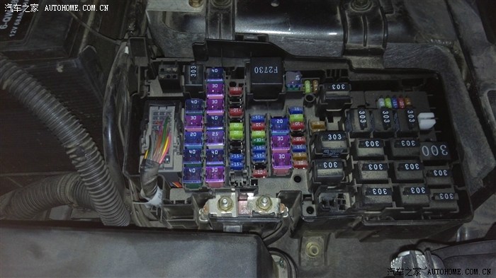 白线接在盒内的近光灯保险上,我接的是左边的近光灯保险上(接在右边的也可以)。用尖嘴钳拔出保险,剪掉白线上的铁片,露出铜线,将铜线用保险丝插入保险中。