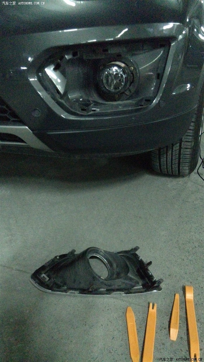 先是拆下二个雾灯罩,因为一切有准备,为了这次的安装拆改,从T宝购买了拆装工具翘板,是塑料的,这个非常重要,网上有用一字改锥拆灯罩的,由于不小心,划坏了车漆,造成不必要的破坏,塑料翘板很好用,不会对车漆造成损坏。相对说拆下灯罩不是太费劲,用点劲,柔和一些,就会完好无损的拆下来。