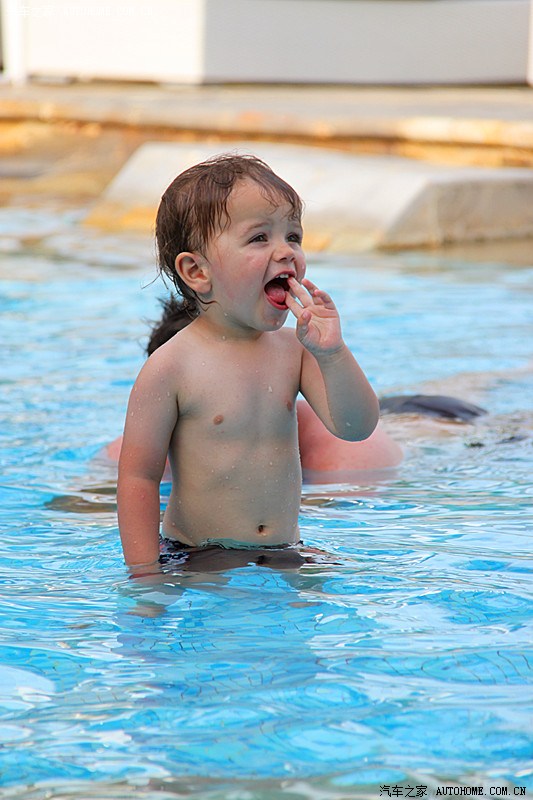 小孩脸上涂满了防晒霜,年龄小,泳技可是一流,像小鱼一样在水里扎猛子,看来平时就经常活动。