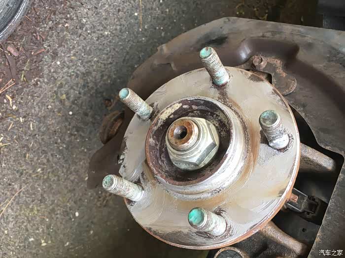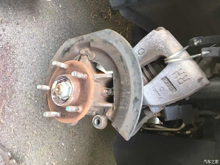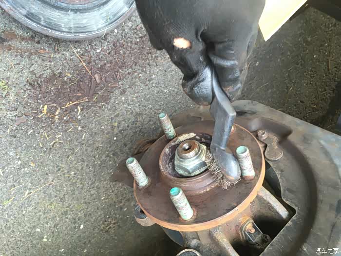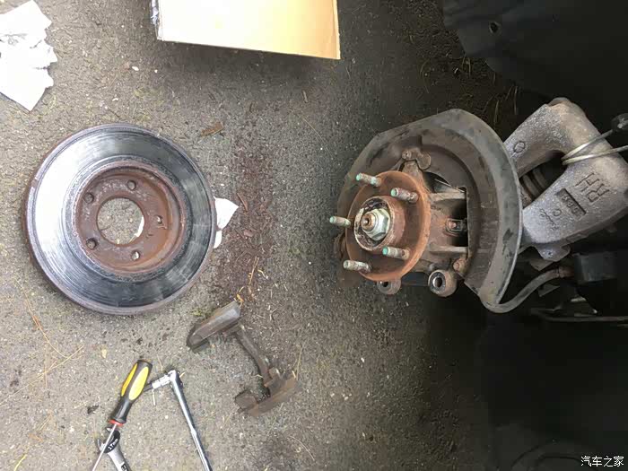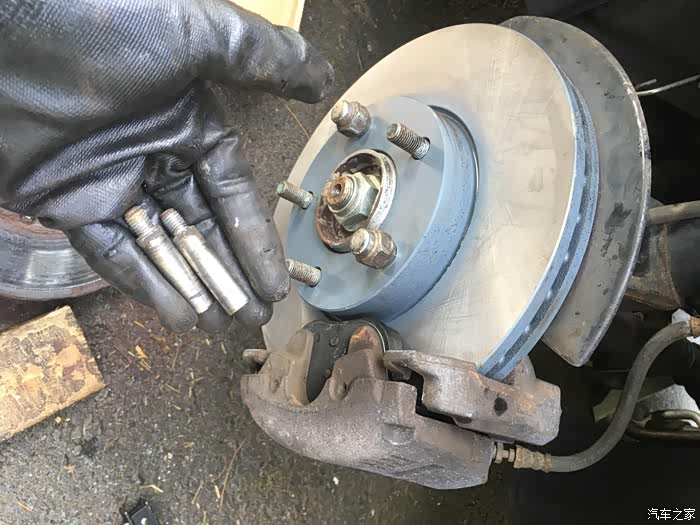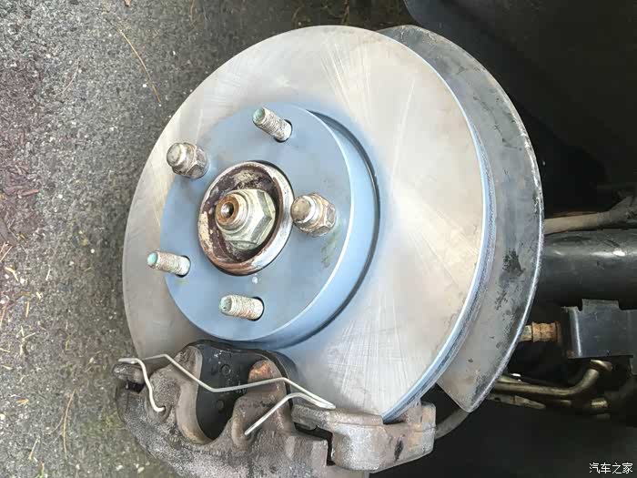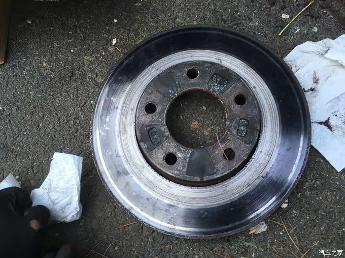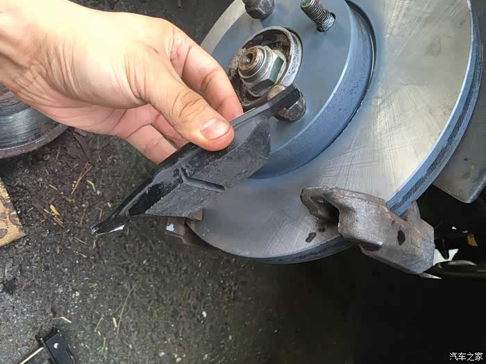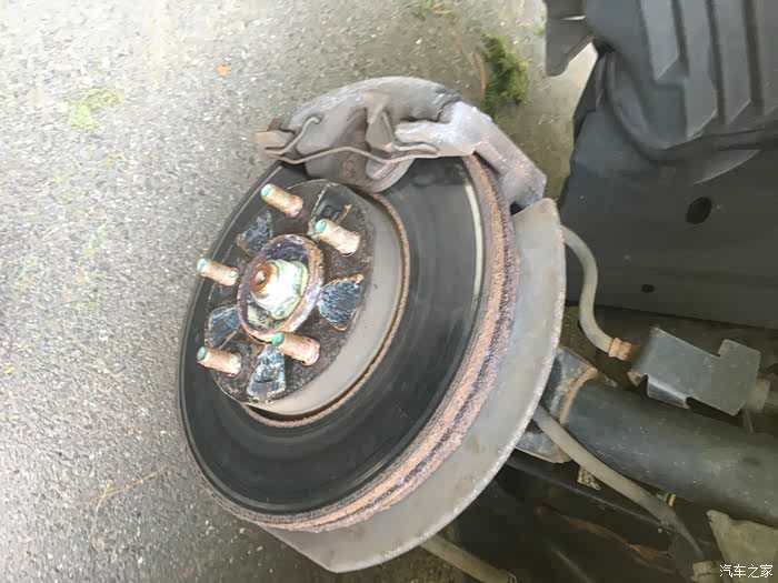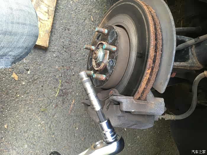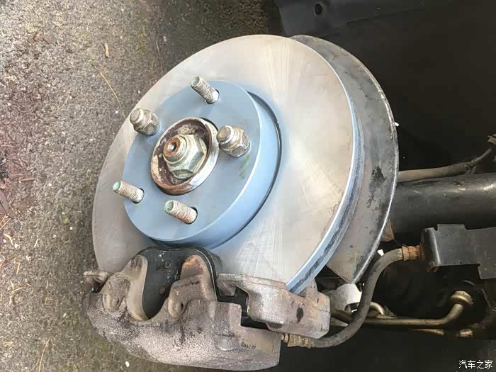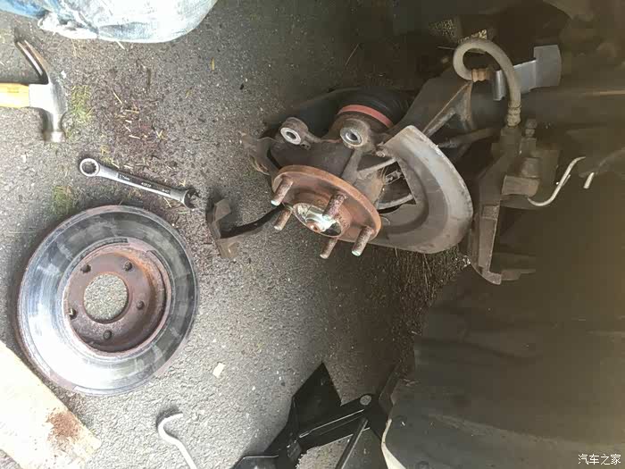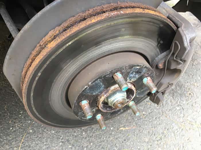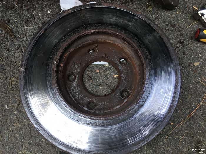 关于换刹车盘片,最大难度一般就是拆旧盘,以前遇到过很多次锈死的情况。比如前面那个2005款的老马自达3就是,时间太久了,锈的太死,两个人轮着锤子敲了半天搞不下来,最后只好装回去,让他去汽修店弄了。这次2011款的好歹是年份比较近,锈的没那么死,不过我们也是每个旧刹车盘都敲了几十锤子,铁锈掉了一地,才给搞下来的。