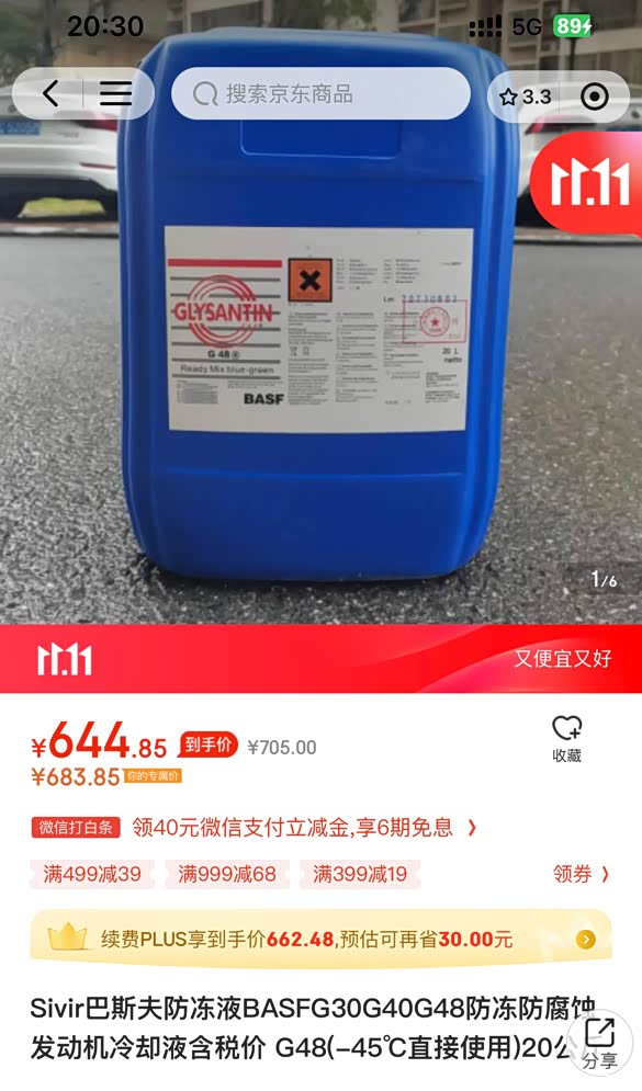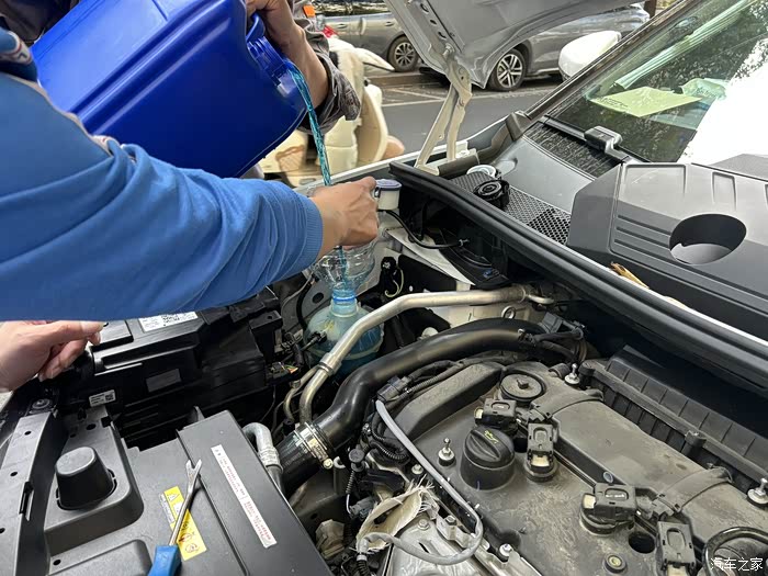 最近天逸的车友群里都在讨论防冻液的问题,说实话我对这些不懂,天天在群里看他们说法系防冻液沸点低,容易蒸发,长时间不更换容易堵暖风水箱,也是无语了,心想着咱的车质保5年15万公里,随便跑也没事,之前去保养的时候确实有防冻液减少的情况,不过4S店都给免费添加了,这不前几天强哥直接给网上买了一大桶,20升的巴斯夫G48,价格也不便宜,本来想着一个车用5升,起码可以加4台车,打电话咨询我们这边的阳光工匠后,说想要更换的干净就最好照着6升去加,所以这20升也就加三台车了。