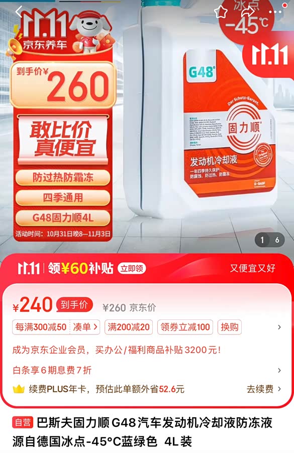 巴斯夫G48防冻液的沸点是130度,而我们购买的沸点是160度,当然也有可能过度宣传了,就按130度也比原车107度要好很多。所以有些东西咱宁可相信也不要去赌,毕竟修一次车子价格不便宜。
