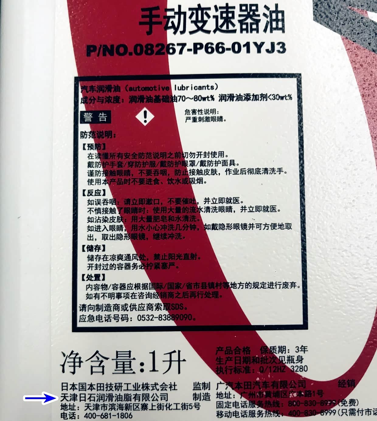 这款广汽本田MTF 3由天津日石代工生产,日石代工的润滑油粘度偏低。