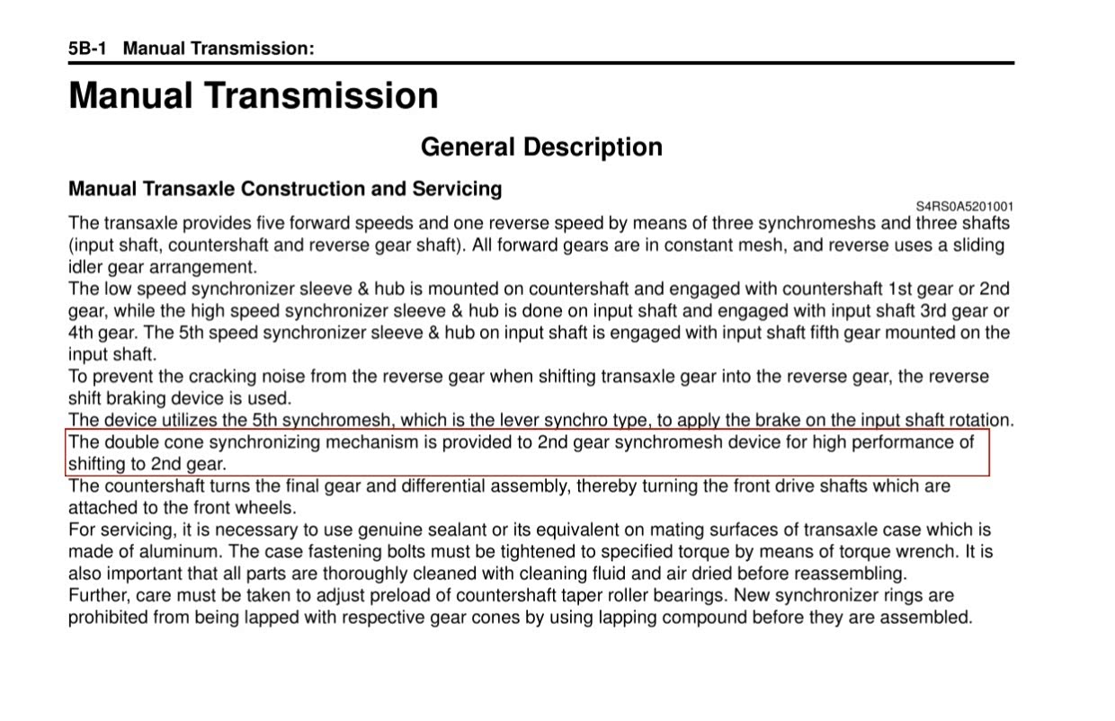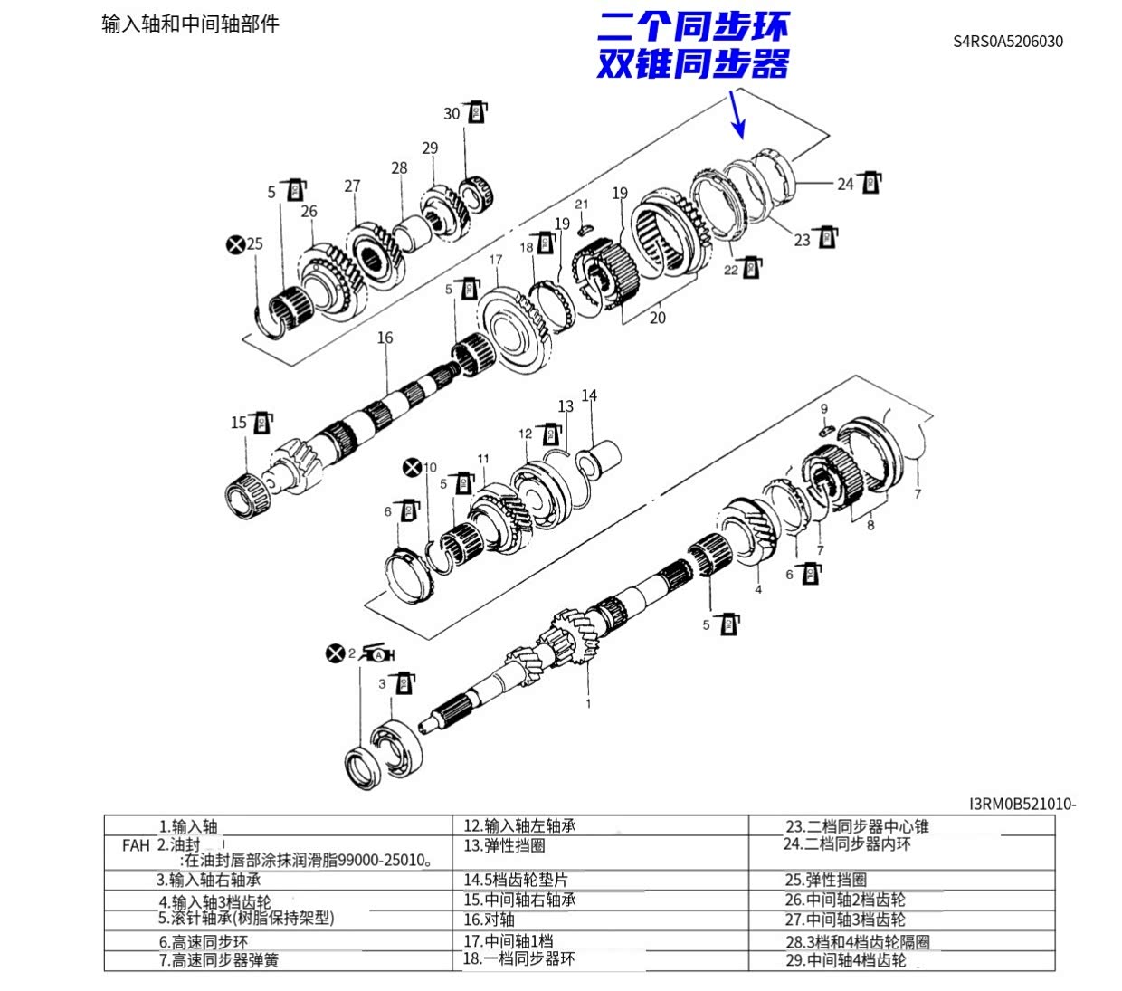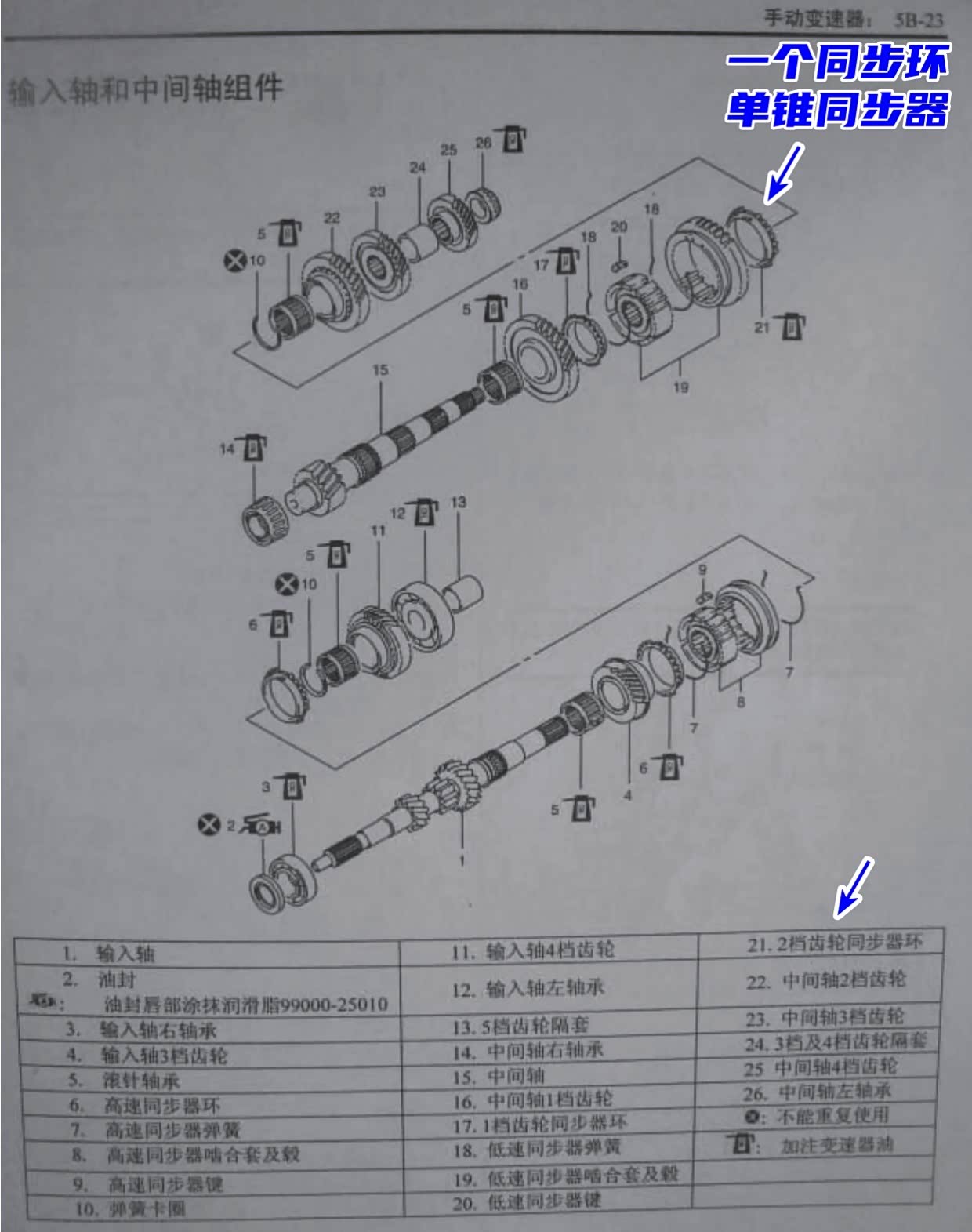 2005中文版雨燕维修手册中,二档只有1个同步环,单锥同步器。