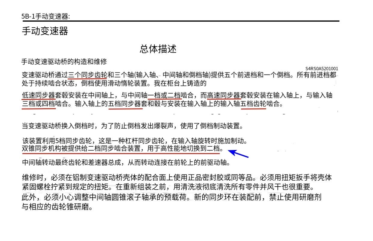 英文版手动变速箱介绍,二档配备双锥同步机构,用于高性能的切换二档。