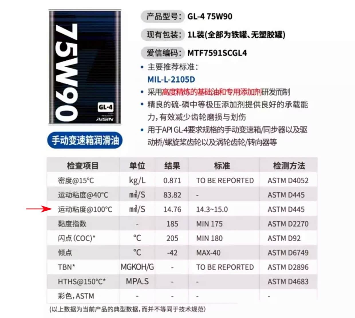 现在来看爱信75W90变速箱油,粘度达到14.76 cSt,属于高粘度的油品,如此高的粘度已不适合雨燕的用油标准。