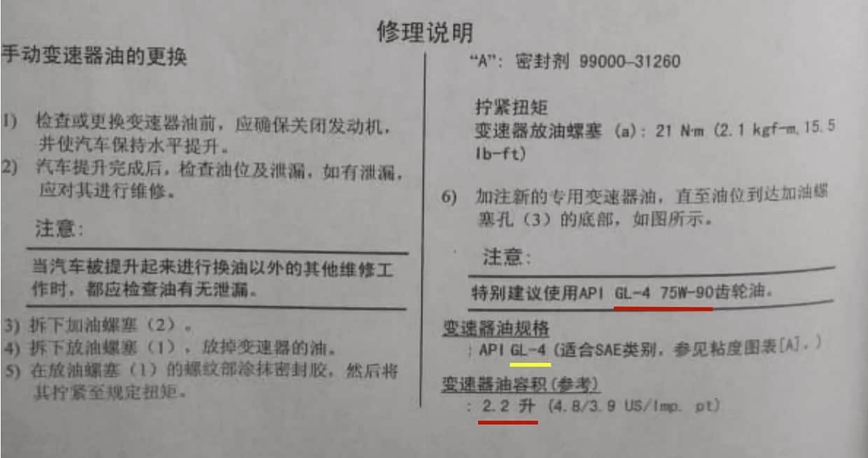 维修手册上介绍,这款变速箱需要使用75W90的齿轮油,油品规格GL-4,容量2.2升。