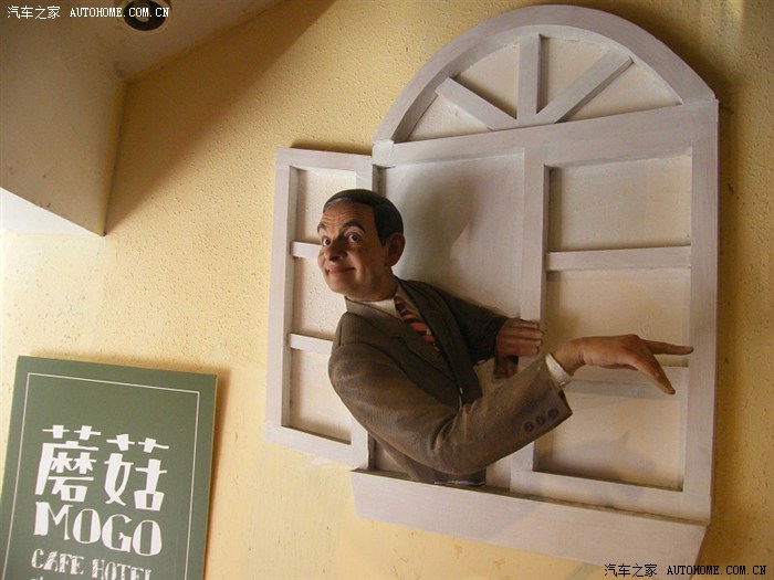 终于到了我们的旅馆:蘑菇咖啡休闲旅馆,真心不错,还有憨豆先生指路