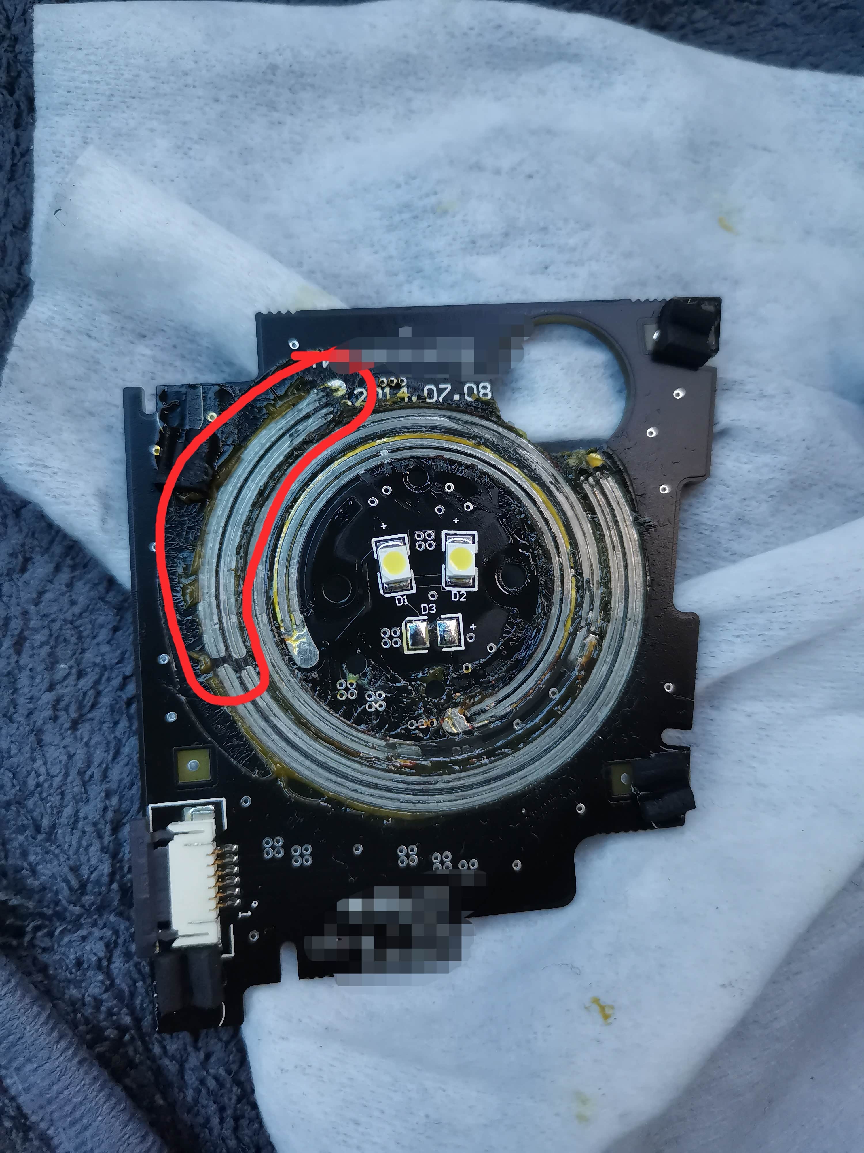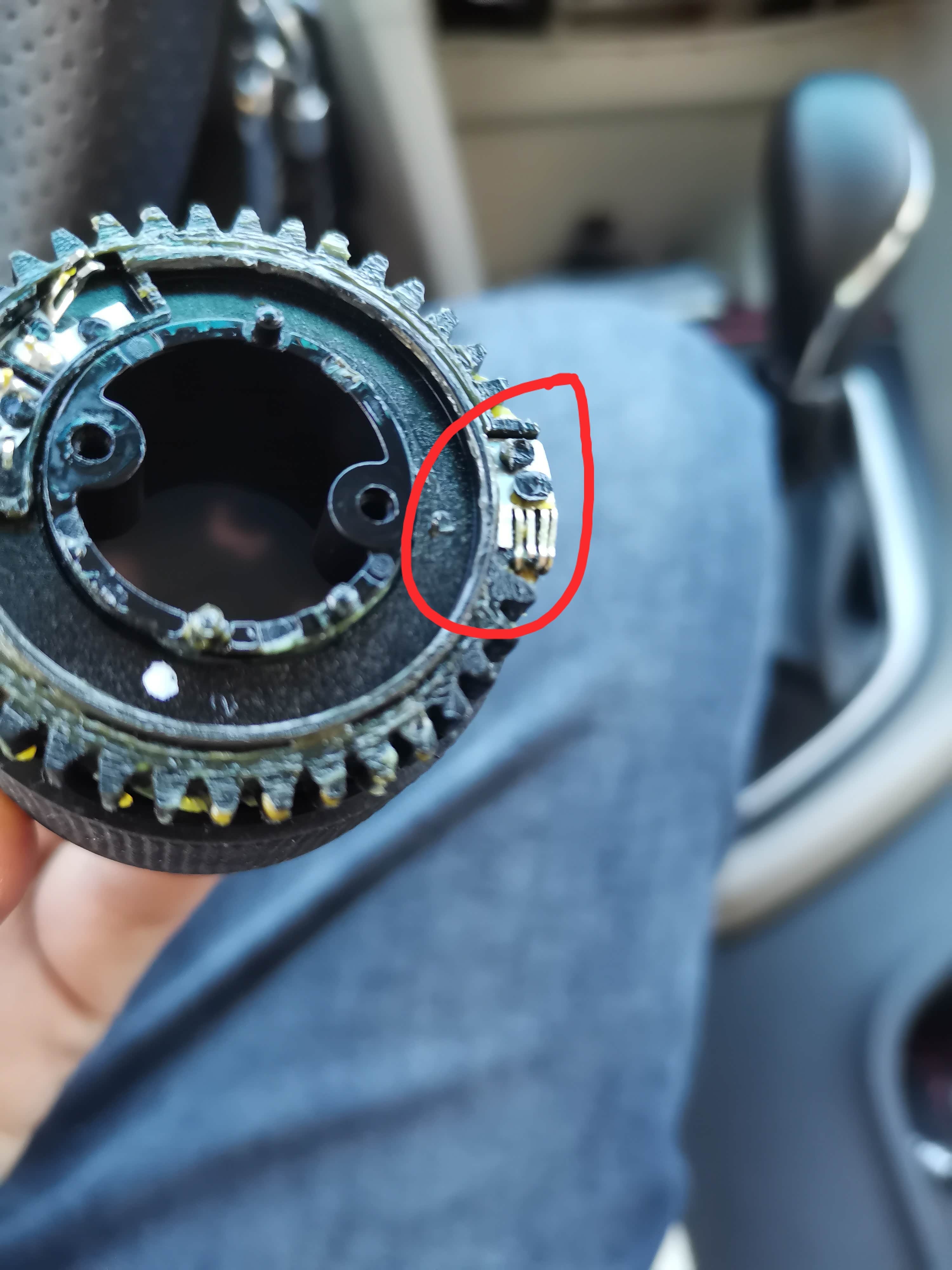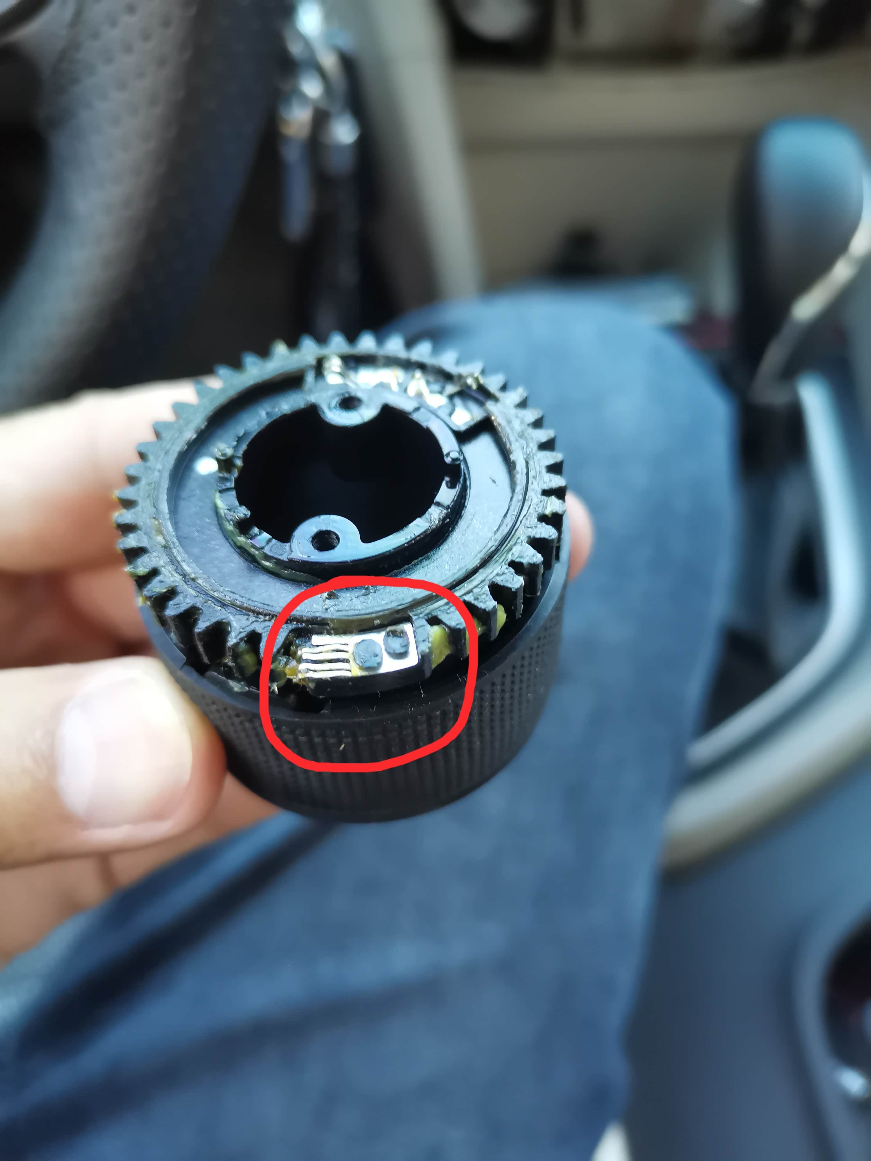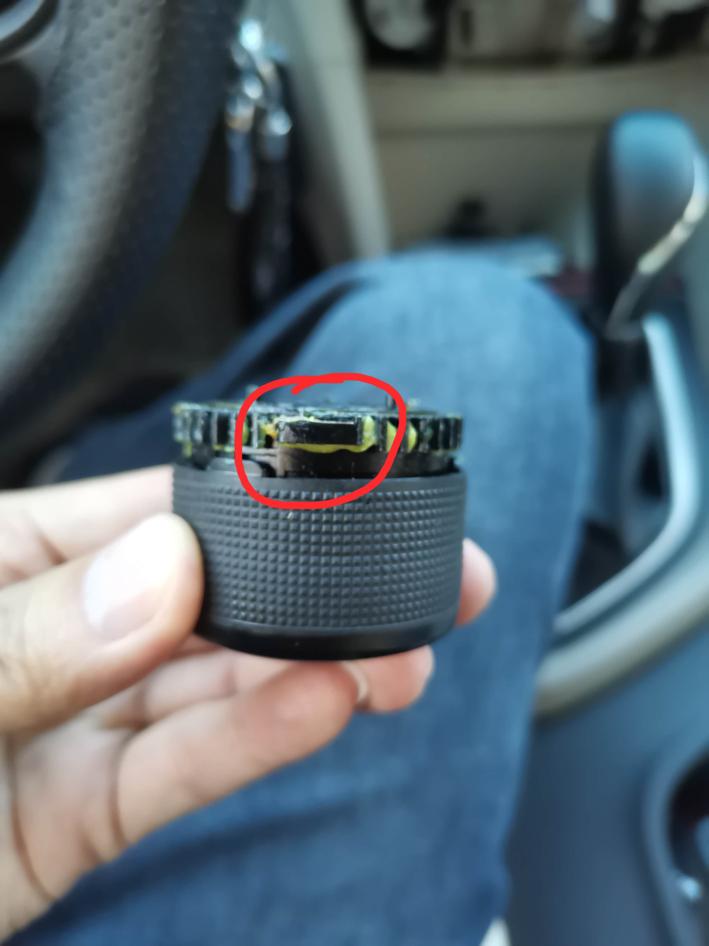 外壳分开后把调节吹风模式的旋钮排线断开,把旋钮总成取下,最外侧有一个4爪的金属弹片,把他压平就可以了,它对应的是电路板上红色圈?出来的导电金属条,每次吹风挡的时候那四爪的金属片都会把这两个金属条接通,相当于开关,压平了就不起作用了,也就解决了联动空调的问题,而且任意档位手动打开和关闭AC都不受影响。