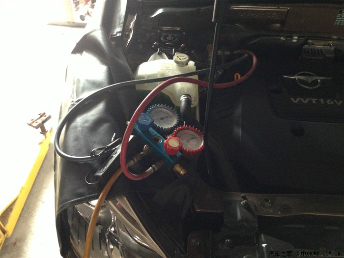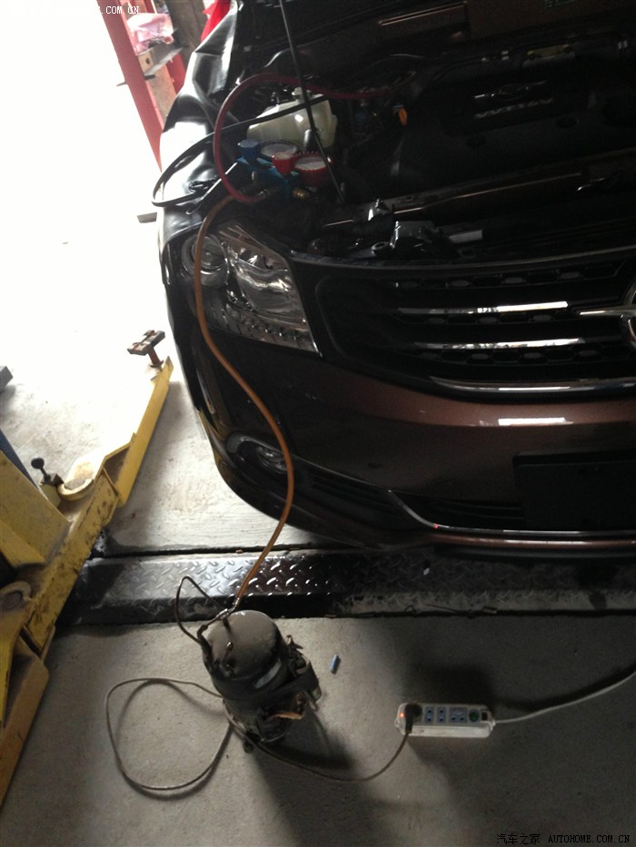 这里我只想给坛里空调出问题的朋友一个建议,你要是离4s店近而且有时间和他们磨,直接将车开去不和他们废话,直接要求排空原车冷媒,按标准程序加入新品牌的冷媒。保证你的空调效果让你满意。如果你认识几个修车的朋友,炎炎夏日又不想跑去4s,那就和我一样找个好点的修车行把冷媒换了吧,钱不多,我这里因为是朋友的关系,只是出了三罐冷媒的钱150元。怎么选择大家自己决定。我只能帮各位这么多了,具体修理细节看后面图片。