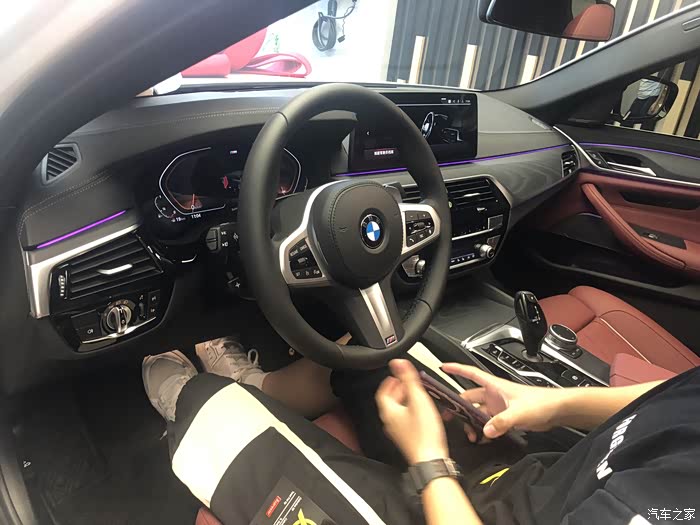 外观方面虽然没有E黑色立标的气场,但我更喜欢5系修长运动的车身设计,由于之前车是黑色的,这次换车老婆坚决说不要黑色的了,最后选定的白外红内,其实我自己更喜欢碳黑色外观+红内饰