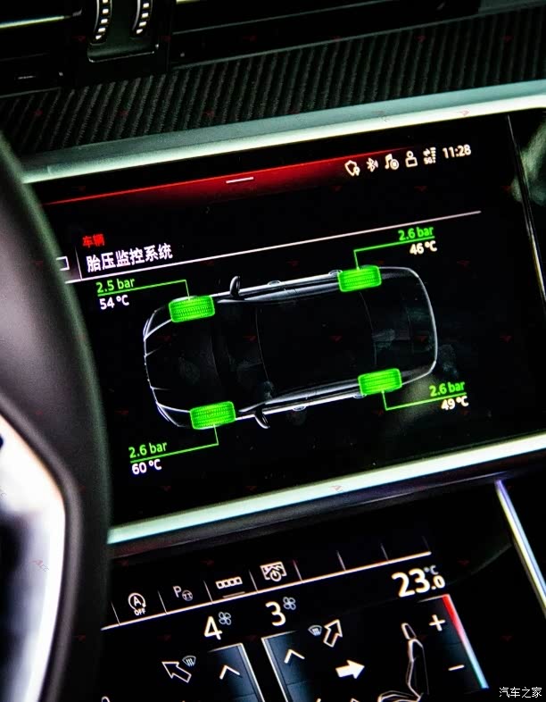 我的车型是黑武士版本,原厂配备的255/35 R21倍耐力轮胎对胎压变化较敏感。冬天胎压相对稳定,夏天胎压上下浮动较大在2.5~2.8之间。建议冷胎压力维持在2.5-2.7Bar区间,冬季可适当增加0.1-0.2Bar,避免单侧胎压偏差超过10%,并且可以通过MMI系统实时查看胎压情况。