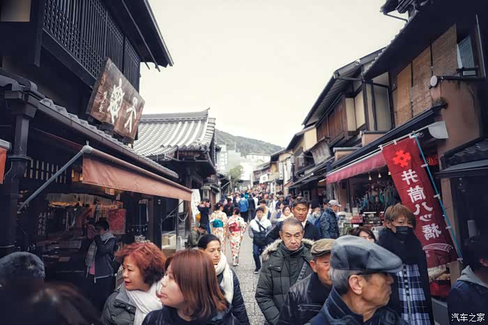 下了巴士,顺着人流不用打听,就可以找到去的方向。去往清水寺是一条上坡路,人超多。这条小路已然没有寺庙附近清静的感觉了,商业化十足,各种纪念品、特色食品应有尽有,人多到什么程度呢,就是拍出来的照片的背景墙会忽略到你哦,哈哈哈!由于天气太冷,我们决定先吃午饭,世界邦推荐了京都老字号甜品店本家西尾八ッ桥旗下的美味荞麦面店。