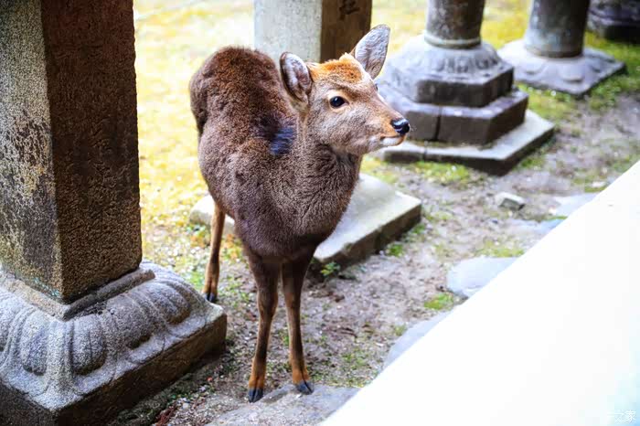 神社内有许多铜质灯笼,据说是由信徒捐献的。神社有很多小鹿在悠闲踱步,它们不怕人,只要你没有吃食,它是不会理你的,虽然没有攻击力,这种人和动物在一起的感觉,对于泽妈还是有一丢丢的害怕。