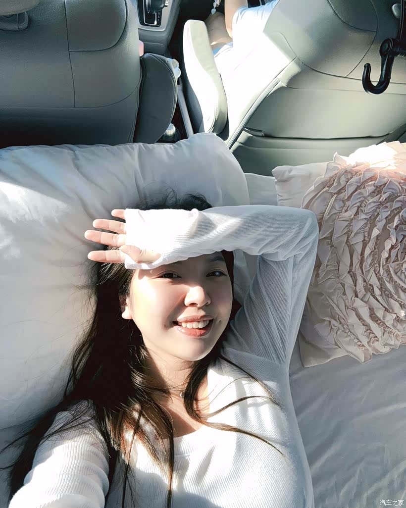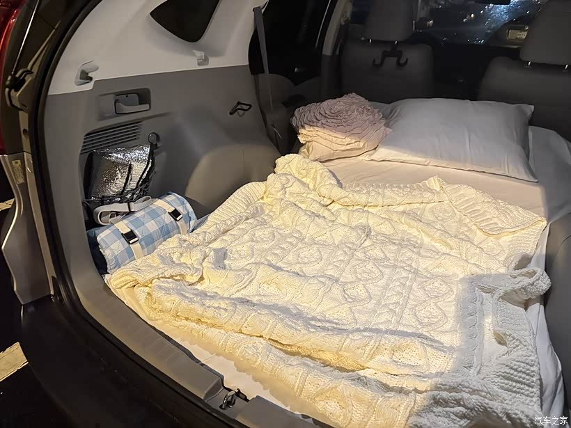 Aileen这次旅程途中,没有订宾馆。就在车内露营。幸好CR-V的后备箱还是比较宽敞的。铺了被子就可以睡觉了。