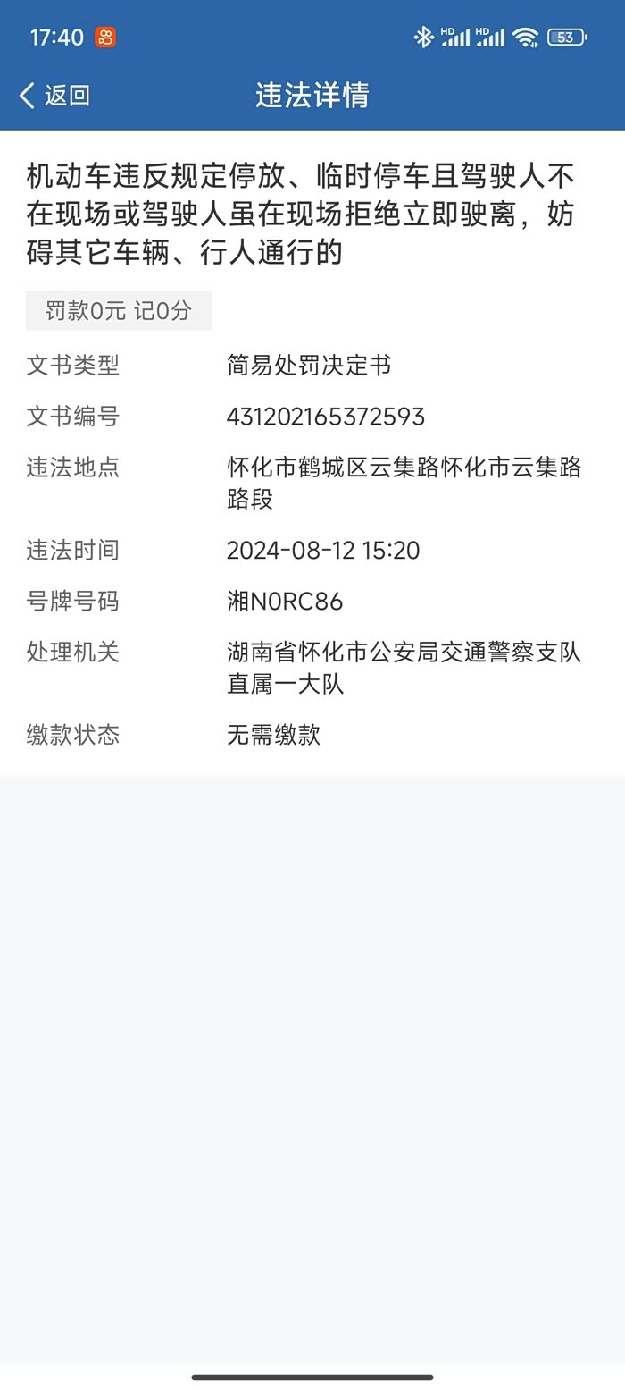 最近的一次违章停车,是因为工作原因,需要取一个快递,真的就只停了10分钟左右,回来的时候就一张罚单飘在车上,当时心情郁闷极了,第一时间查询交管12312,当时应该是处罚还没有上传,弄的我一天心情都不好了,结果第二天发现是免扣分,免罚款,我只能说,感谢政策给我机会。