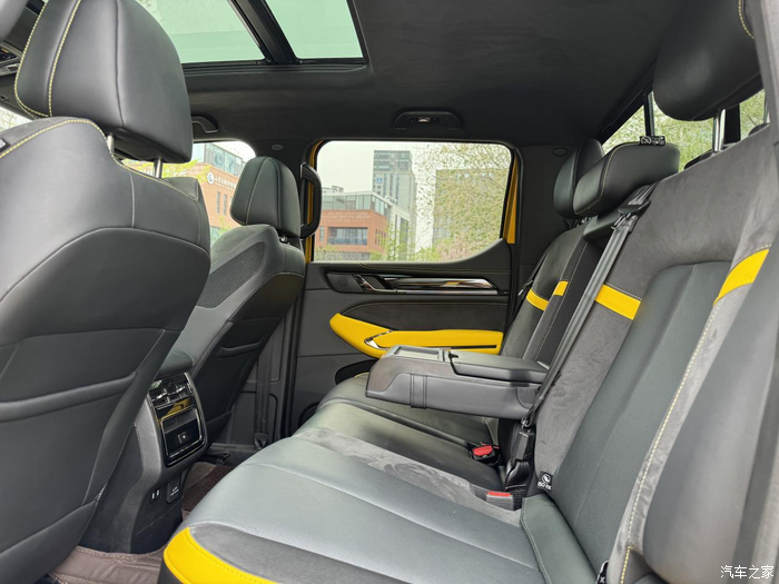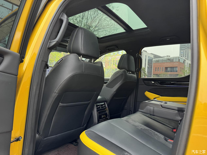 车子的内饰不像我印象中那种很粗糙的皮卡,走的是精致风,中控屏反应挺灵敏,我开车必连蓝牙听歌,等人的时候可能还要玩一下游戏。真皮座椅的通风很好用,夏天我容易出汗,半小时吹下来身上干爽不粘,按摩也挺好用,开长途累了就把车停在服务区按一会儿。
