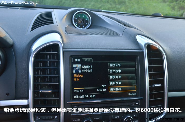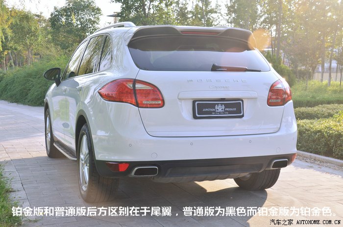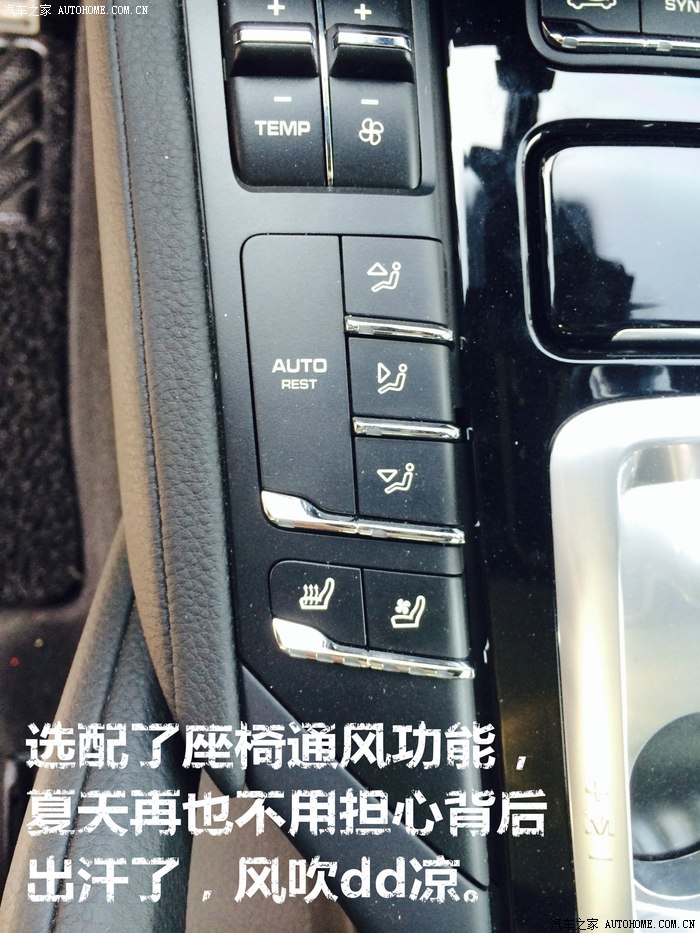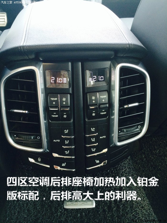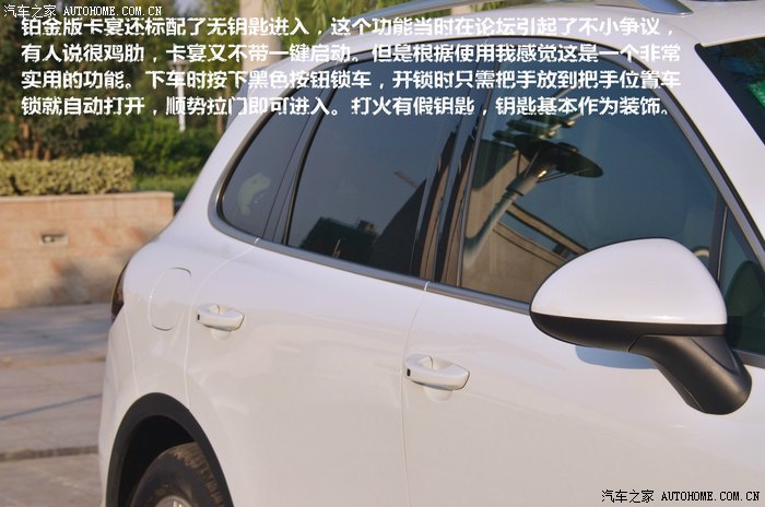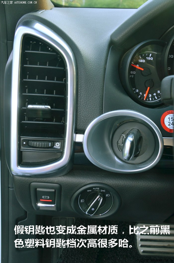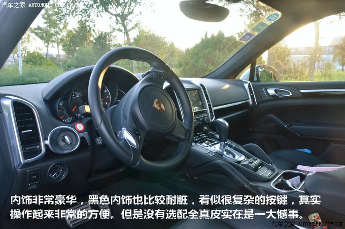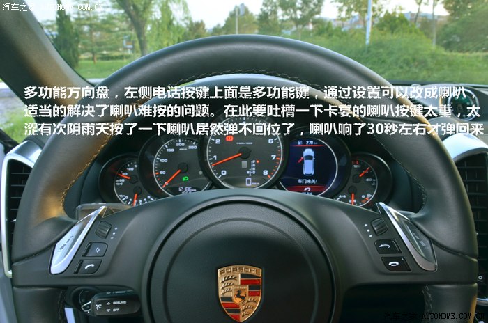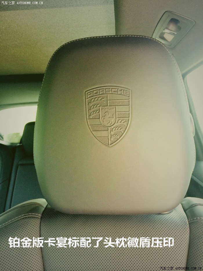 言归正传,在提车的几个月内的使用感受跟大家分享一下。首先说说驾驶方面吧,的确如很多车友所说,换档太不积极了,速度下来了,档位还很高,轻踩油门有种高档低转速的感觉,不过只要你深踩油门,一切都是浮云,档位立刻降下转速上来,推背感还是很爽的。按下sport键以后喷油量瞬间变大,提速很快,非常给力,但是市区还是慎用吧,安全第一。再说说卡宴的刹车把,比较适中,个人感觉需要的时候就能来就可以了,陶瓷刹车没试过,据说很给力,不过普通刹车已经足够满足我的日常使用。车在行驶中车内存在异响,具体哪个位置发出的,我也没有去找,因为你打开音乐基本感觉不到了,没什么大不了。在说说实用性吧,以前开轿车,停车很不方便,现在不管多高的路牙石,基本调调高度都能上去,这点太喜欢了。再说说座椅,车内坐5人不会觉得挤,空间够用,选了14向座椅,虽说是不卡蛋蛋了,但是包裹性没有18向好,转弯的时候感觉最为明显,不过个人觉得没必要上18向,14向足够日常使用。卡宴的后视镜和发现4比起来是小的太多了,但是本人觉得卡宴的后视镜视野完全可以满足日常行车。好了,暂时先说这么多把,大家且看图文解说