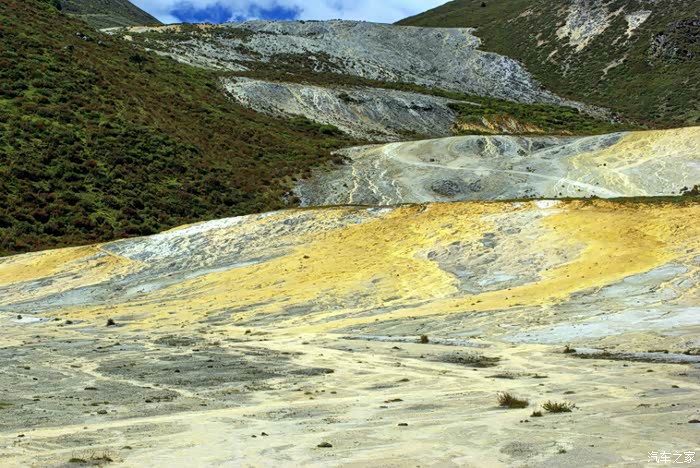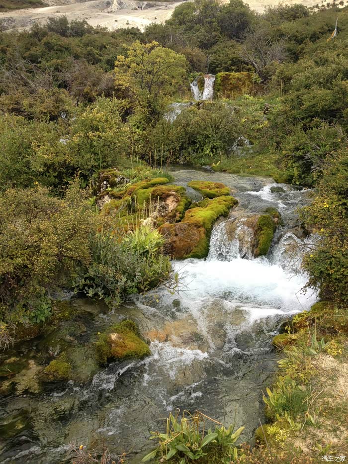 第四阶地白黄色相间,溪水流速很快,冲刷出钙化色彩与形态奇异的溪滩。