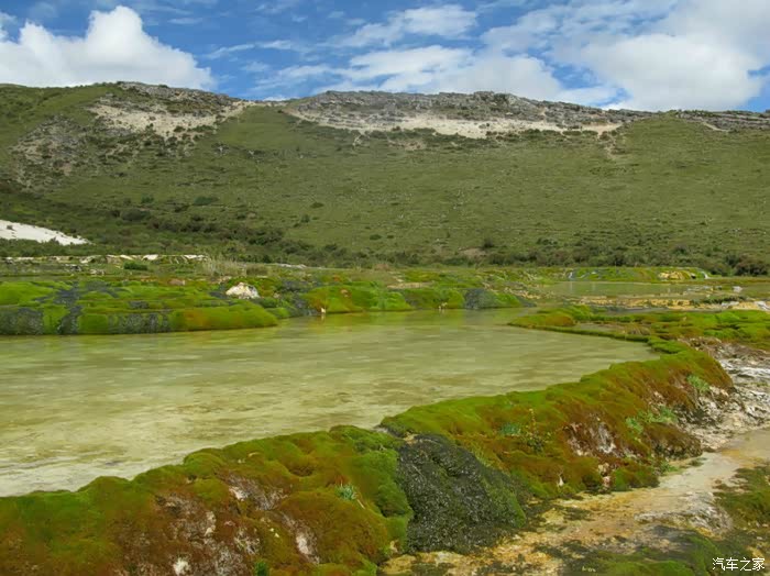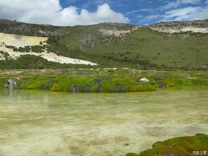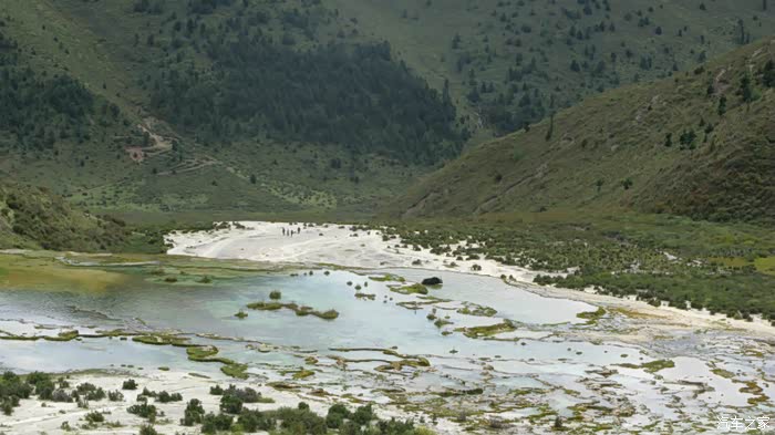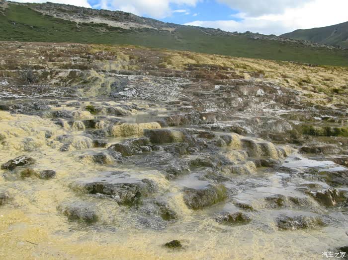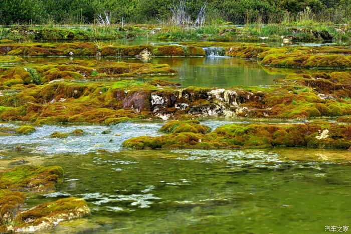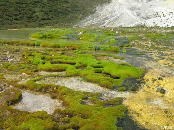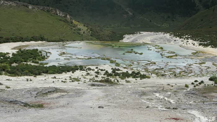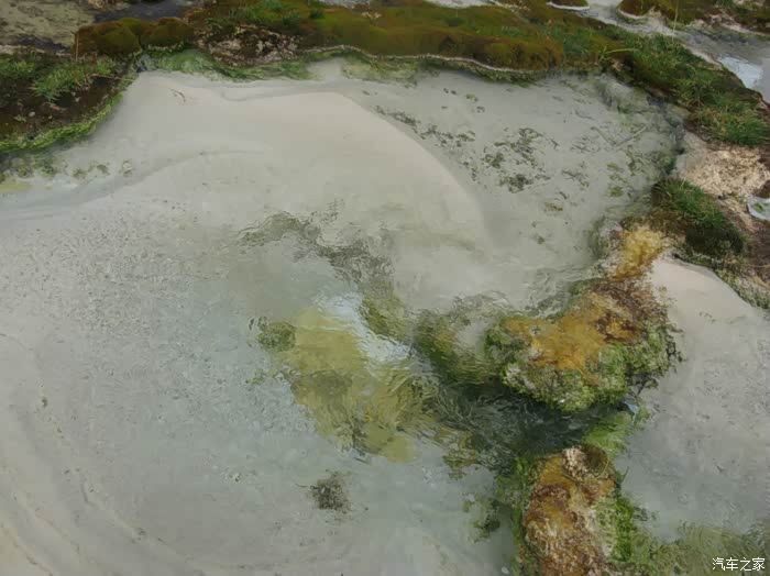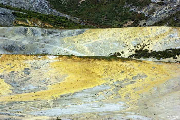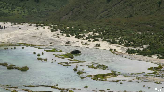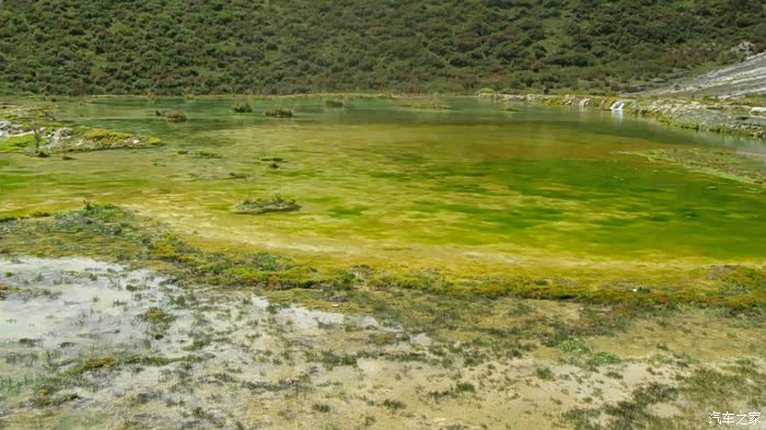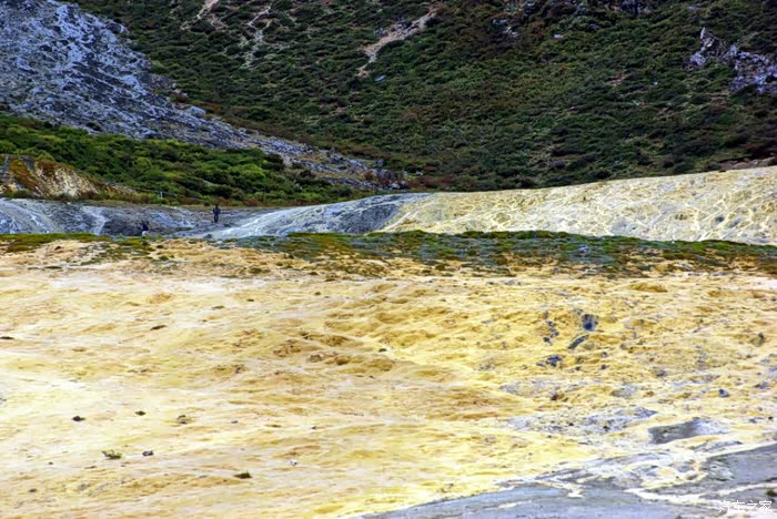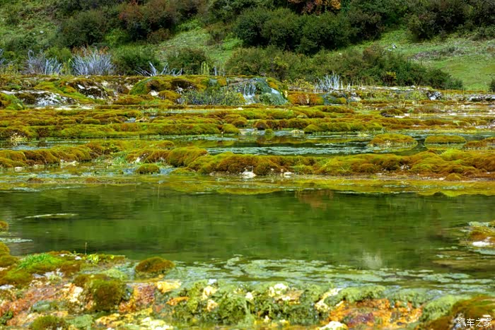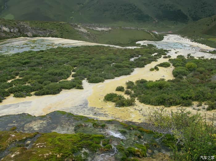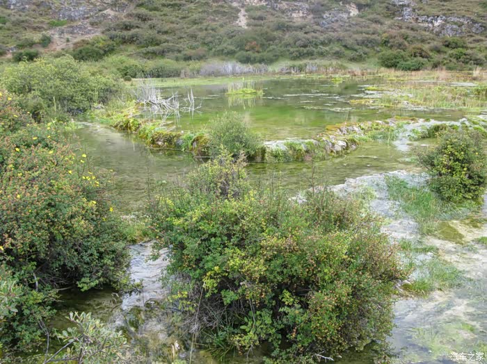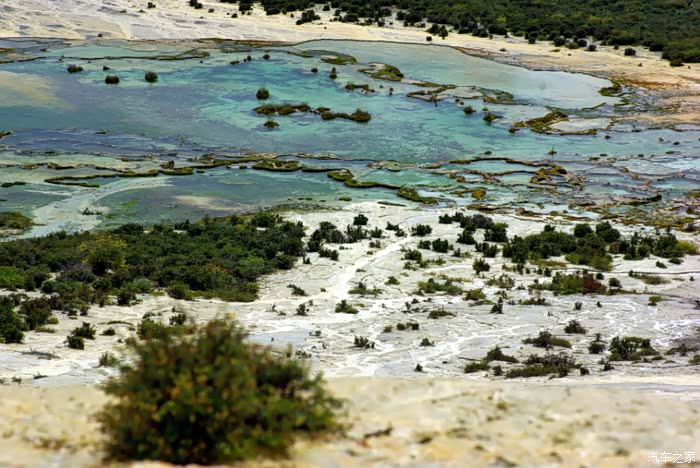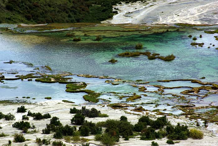 第五阶地又是数十个大小不同、形态各异的五色彩池,灌木植被很密,泉华滩继续展示独特魅力。