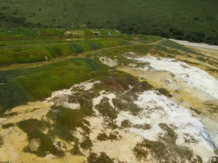 仰视泉华滩层层阶地,至第六层已遭密林阻路,更无缘第八层的间歇泉,藏族大妈说:七层八层要自己走啰!也就是无路可走的意思。