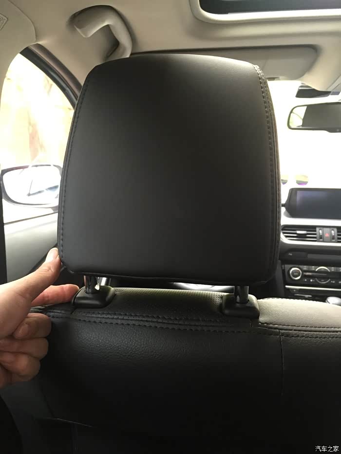 头枕的调节方式就是按头枕左侧的按钮。头枕真硬啊,哎。座椅都做的那么到位了,真皮打孔,缝线均匀,坐着也舒服,头枕干嘛弄那么硬啊。