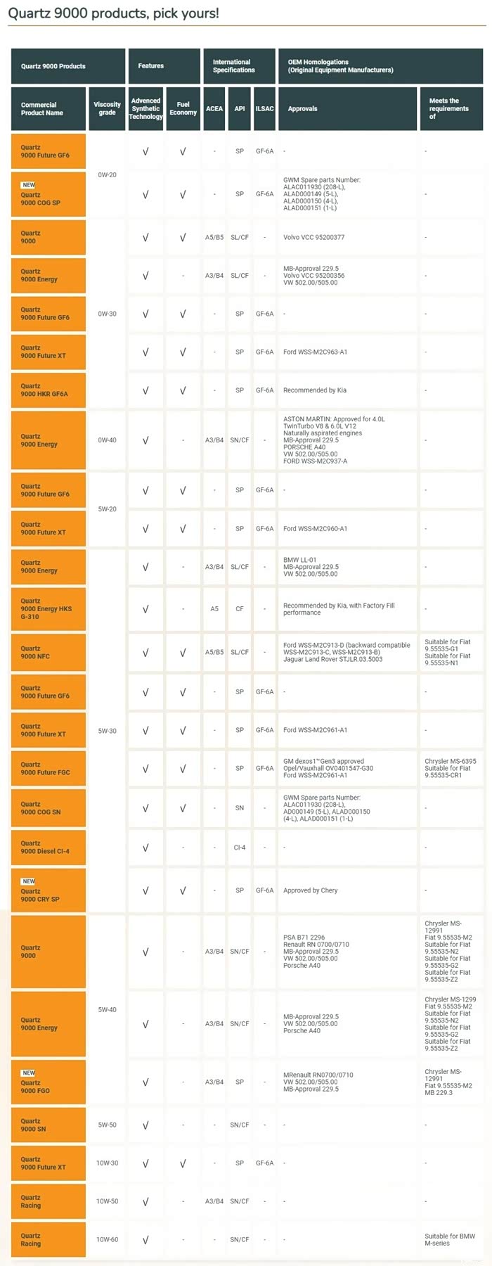 注:只显示中高端产品,Quartz Energy(极驰)不含20黏度。