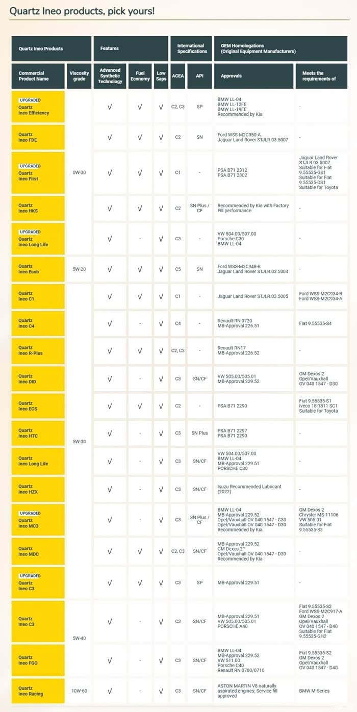 高标高认推荐:Quartz Ineo Xtra Long Life 0W-20;Quartz Ineo Xtra EC6 0W-20;Quartz Ineo Xtra C5 0W-20;Quartz Ineo Xtra D***mics 0W-20;