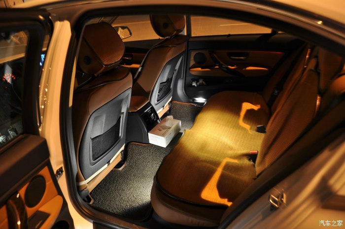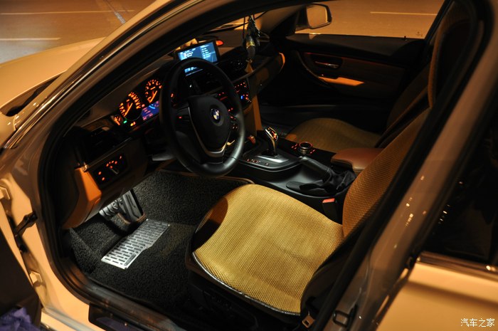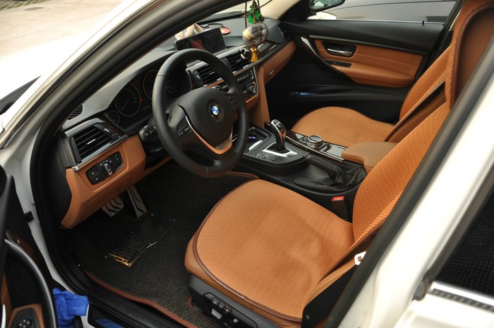 5.内饰☆☆☆☆:新三系的内饰依然保持了宝马一贯的风格,没有多少新鲜感,用料还是比较考究,华晨在细节方面有待加强(有些地方的缝隙不忍直视)。方向盘的握感非常出色,带有拇指槽的设计非常符合人体的工学原理,让人握上去就有非常强的驾驶欲望和冲动,同时换挡拨片给新三系增添了许多运动的元素。值得一提的是,小改款后320Li豪华设计套装的电子档杆采用的是过去只有给3.0T车型使用的圆头电子档杆,而不是7系、X6上那种方头的档杆,这种档杆更为高档,更有手感,也特别凸显运动气息。赞一下这个档杆!我个人比较喜欢马鞍棕的内饰颜色,但是实在是太容易脏了,特别容易染上牛仔裤的颜色,半个月就要来次内饰清洗(楼主比较爱干净,经常被媳妇说是处女座的),夏天楼主经常运动,出汗之后靠在座椅上,没有座椅通风,也是十分难受,最后无奈加了个免绑坐垫。不过等到天气凉爽了,就赶紧把坐垫拿掉,还是什么都不加,坐的舒服。