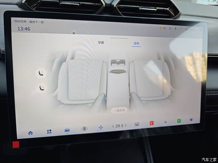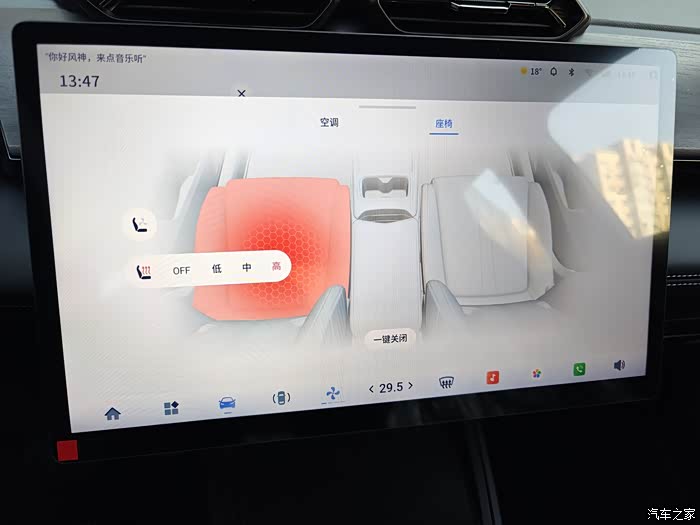 而风神L7纯电版车机里我最喜欢的就是调节空调和座椅通风加热的界面,非常直接的体现如何吹风、如何升温或者降温外加座椅加热的强度。利用这种精确的空调模式可以让车内、座椅的温度很快达到需求的,让驾驶人员和车内其他乘客有一个非常好的环境。