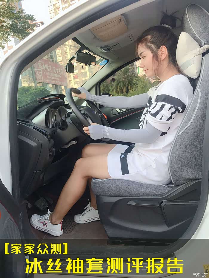 女司机戴上冰丝袖套,给出评价是:空调风吹在手臂上,真的很冰爽。