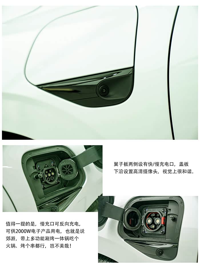 充电口设置在两侧翼子板位置,并且慢充口可反向充电,全系标配,利用率大大提升。