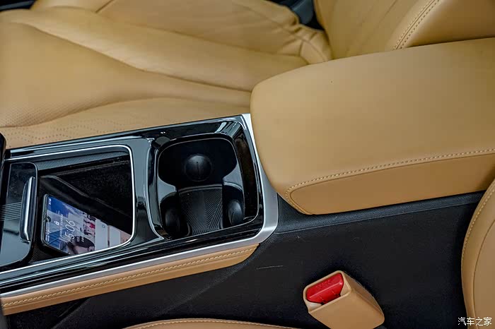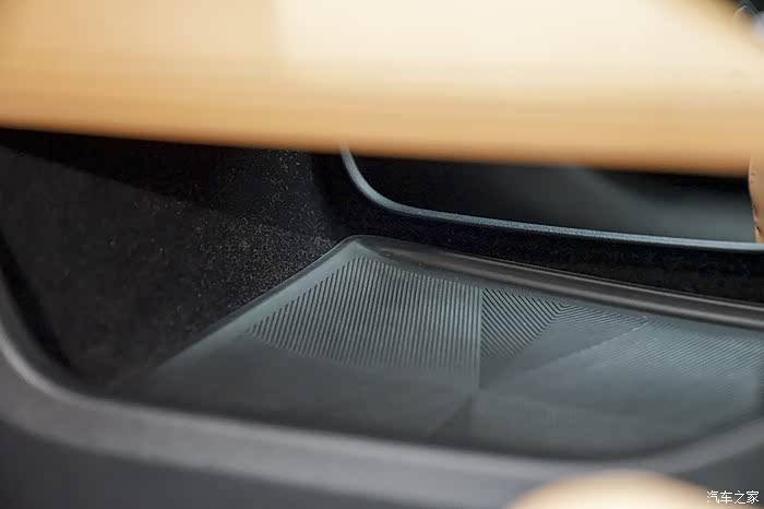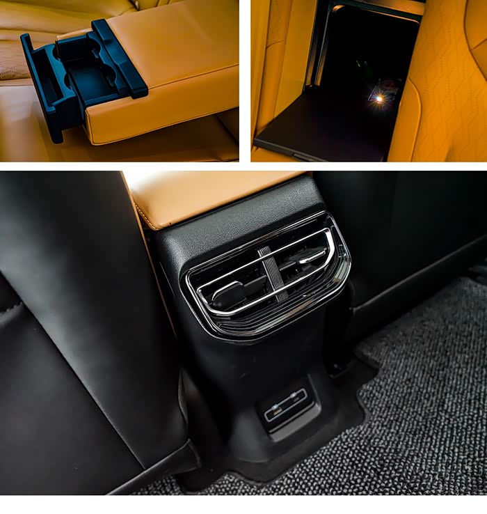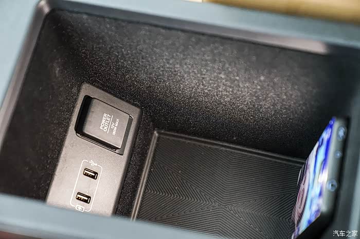 地台处设置一个储物格,两个杯座以及后方的扶手架,扶手架内部设有两个USB和一个12V电源接口,供电子产品用电较便利;地台下方是掏空设计,放一些随身物品很不错,各处储物空间也都非常可观。