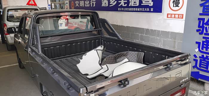 五菱征途的货厢内部纯平,完全是一个大平板,另外它的货厢三面可开,这一点比其它的皮卡要好很多,在货厢内东西多的时候,直接放下侧面的挡板就可以拿到最深处的东西,实用。征途的货厢地板高度很低,基本上我蹦一下就能上货厢了。货厢挡板外面有很多锚点,拉重物的时候方便固定,而且它后悬架是加强的钢板弹簧,理论来说拉的越沉,它跑的越稳。