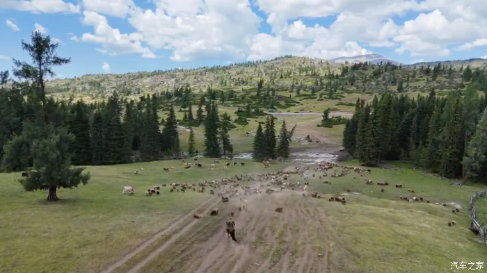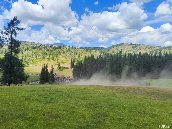 由于我们没有进景区,所以时间很松弛,G219到铁热克提乡之前右手边有条岔路,能直通喀纳斯贾登峪那边,路况非常好,一路上的景色也是特别美,路旁有很多岔口,看到有车辙印的,都可以直接下道开始狂飙,每一帧都是草原森林同框典型的阿勒泰景观。