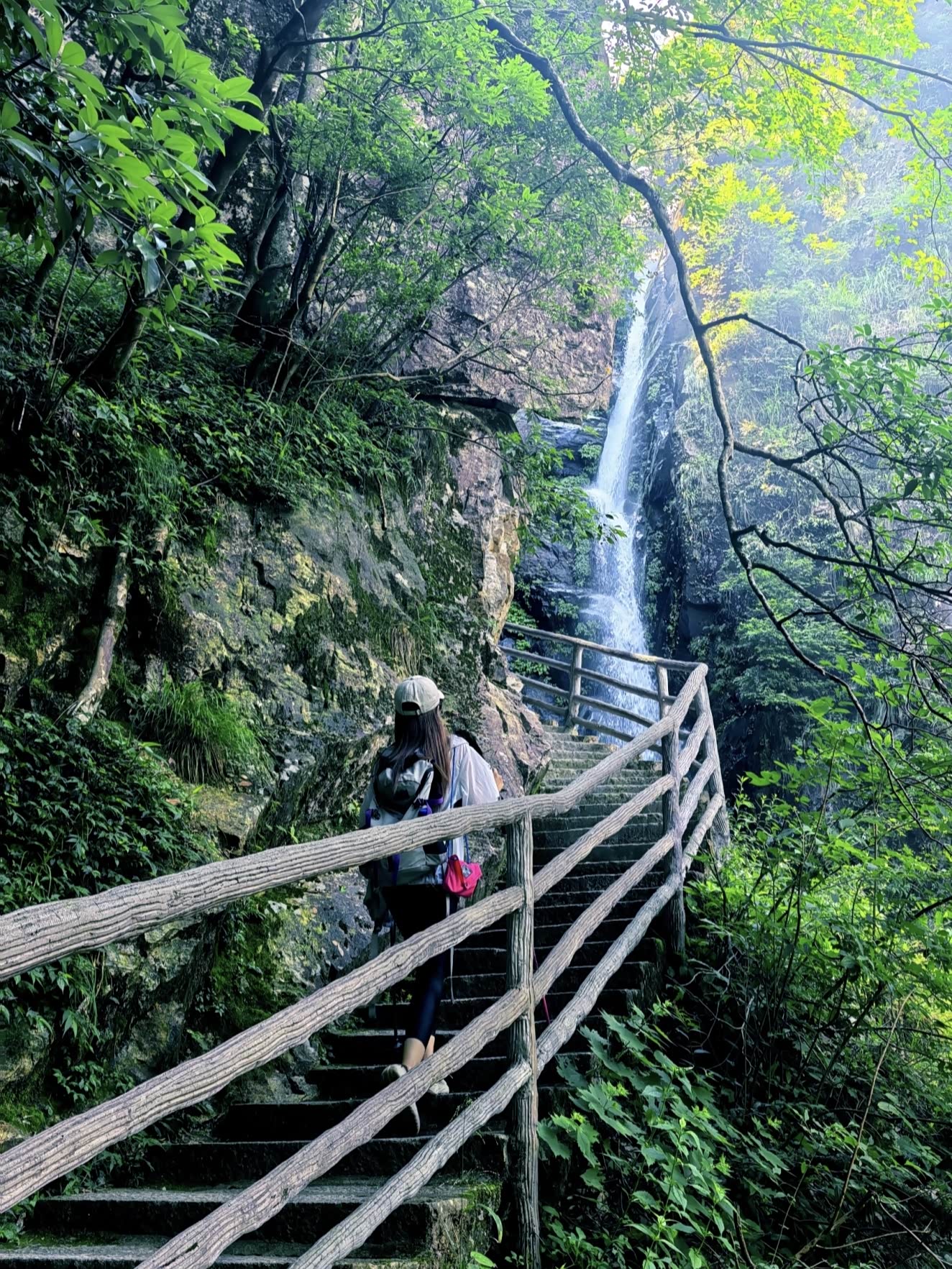 看完日出,上午时分,我们慢悠悠地坐缆车到中站,然后徒步下山,去探寻那五道藏在林间的瀑布。沿着蜿蜒的山路前行,还未见到瀑布,那如雷般的水声便已传入耳中。转过一个弯,第一道瀑布如一条巨龙从陡峭的悬崖上飞泻而下,撞击在岩石上,溅起层层雪白的浪花,水珠四溅,如碎玉飞花,在阳光的照耀下闪烁着五彩的光芒。那磅礴的气势,仿佛要将整个世界都吞噬。