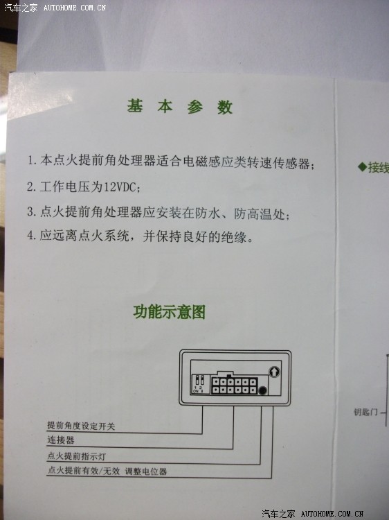 调整提前角度的微动开关在左侧,中间是线束插口,右侧有一个电位器和红色LED灯。当水温看一下怠速时红灯状态,红灯亮则表示提前角控制器工作。这时要逆时针调整电位器直到LED灯熄灭,保证怠速时不亮。用手稍微动一下油门线,红灯亮。如果不是,再顺时针微调。