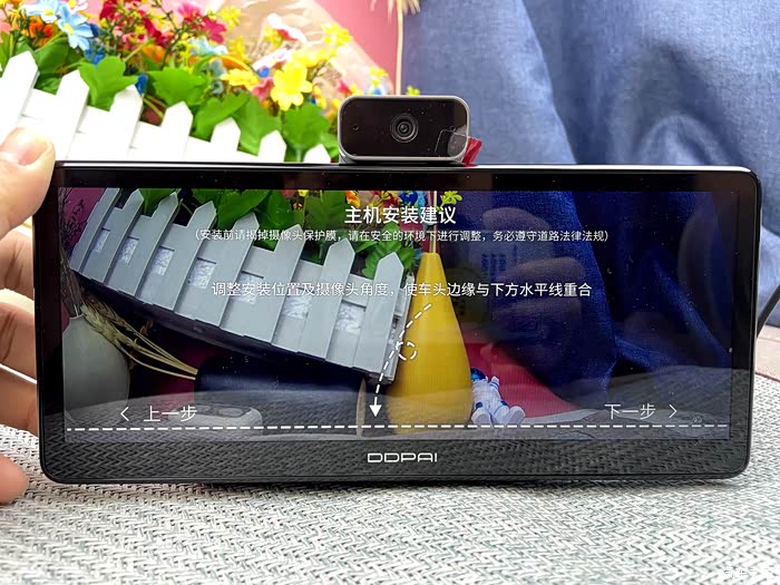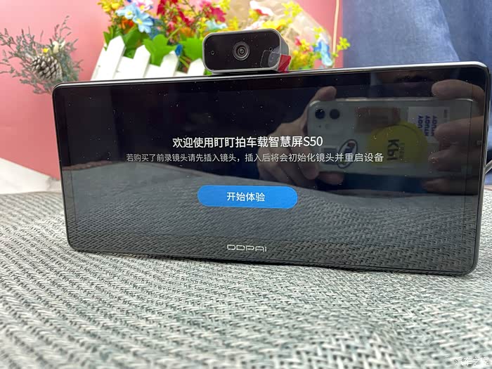 首次使用时,盯盯拍车载智慧屏S50开机会有个初始化设置过程,系统有非常详细的引导说明,跟着提示完成下一步即可。由于内置了行车记录仪,所以S50设置时会有一个镜头角度调节,根据屏幕水平线提示调整合适角度即可。