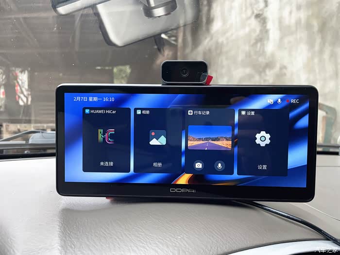 在未连接手机前,智慧屏S50默认会进入系统菜单,主页面有前后行车记录仪,浏览相册或进入系统设置四个菜单选项可以使用。