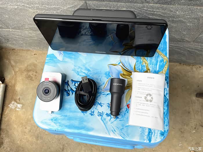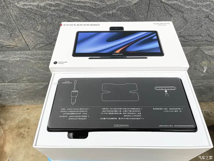 打开包装可以看到内部做了分层布局设计,上层收纳了主机,下层摆放着各种配件。包装内物品主要有:智慧屏S50本体、超广角摄像头模块、车充、电源线、六角扳手以及带背胶的电源线固定卡扣、用户手册和保修卡。