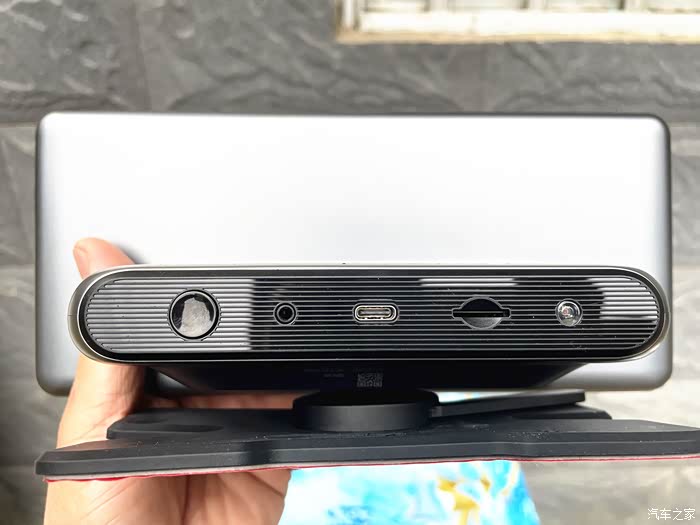 盯盯拍车载智慧屏S50的I/O模块全部位于机身背部,并且装饰有立体拉丝面板,从左到右依次是多功能开关,后摄接口、Type-C接口、TF卡扩展接口(最大支持128G)、专业光线传感器。
