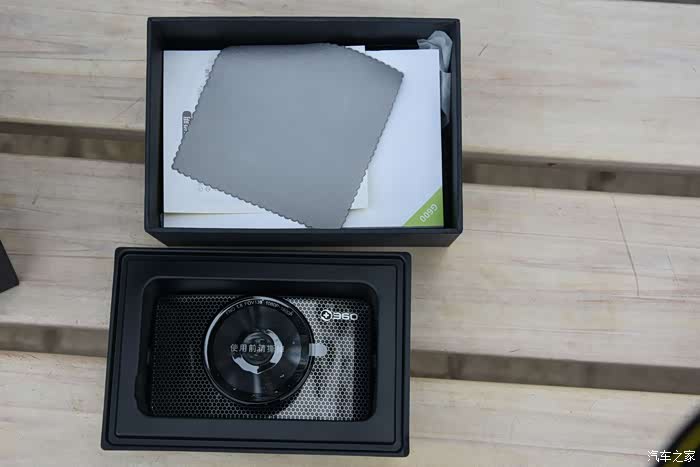 商品包装,一个简洁大方的黑色包装箱,上面印着360记录仪G600,很简洁的告诉了你是什么品牌,什么产品,什么型号。