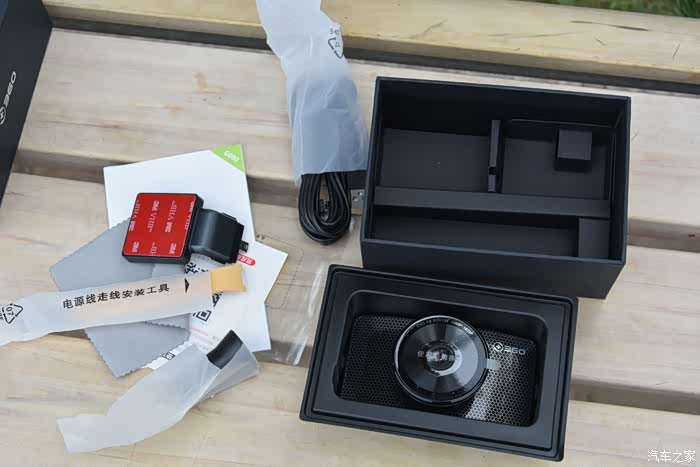 记录仪的下面还有夹层,打开之后,是附赠的很多配件,包括:电源线、电源插头、安装工具、静电贴、说明书、擦镜布、二维码(应该是用于挪车的)和一个最重要的就是GPS模块。