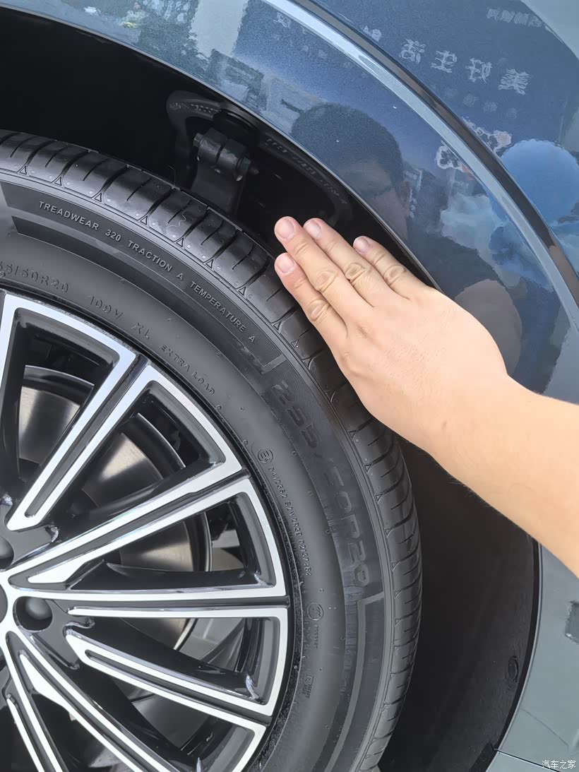 ④顶配车型是有空悬的,在锁车后会自动降到最低位置。而其它配置没有空悬,我简单测试了下次顶配车型的轮胎与汽车车身的间距,大概是4指的距离,而有空悬的车型则其最高底盘与车身的距离有1个半手掌的距离,两者的高度还是有明显的区别的,这点也就是说明该车在颠簸路段由于顶配车型有这个底盘高度差优势其通过性会好过其它配置车型。