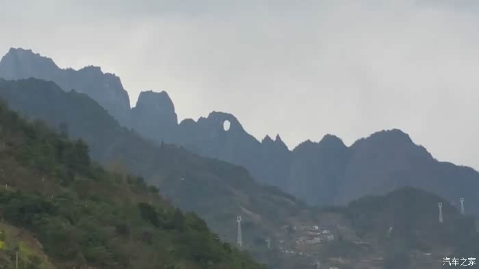 从公路上遥看,清晰可见山峰拖着一轮园月。实际上,这是高黎贡山的一座岩峰开了一个约100米高、直径45米的竖椭圆行大洞,