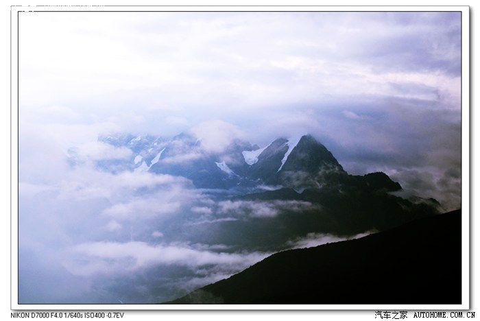 为了尽早与蛙哥汇合,一大早我们就出发了。6:00天才蒙蒙亮,开出康定便是上坡的山路。山间云雾缭绕,地是湿的,空气也是湿的。朦胧中贡嘎雪山时隐时现,看见雪山真是太激动了,马上下车拍摄,可是拿出相机这山却不见了,是在躲猫猫吗?又开了一段,我乘其不备,流下了部分贡嘎雄姿。