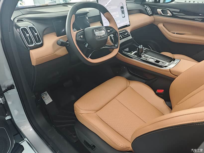 环抱式座舱采用琥珀金/松露灰双色拼接,中控台覆盖软性材质和皮质包裹。3D镭雕水晶挡把和星空顶设计提升豪华感。