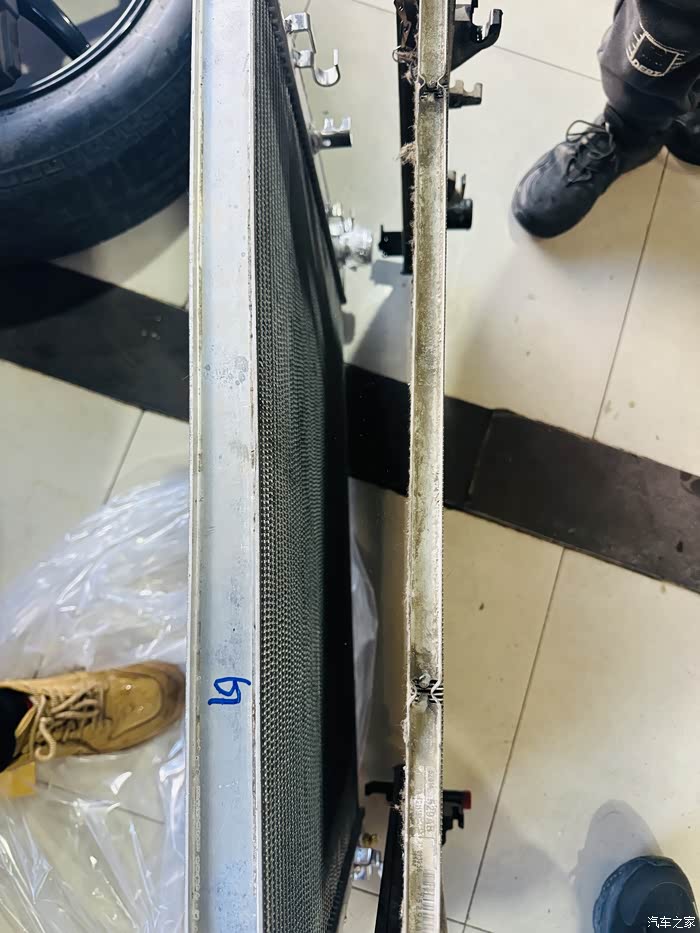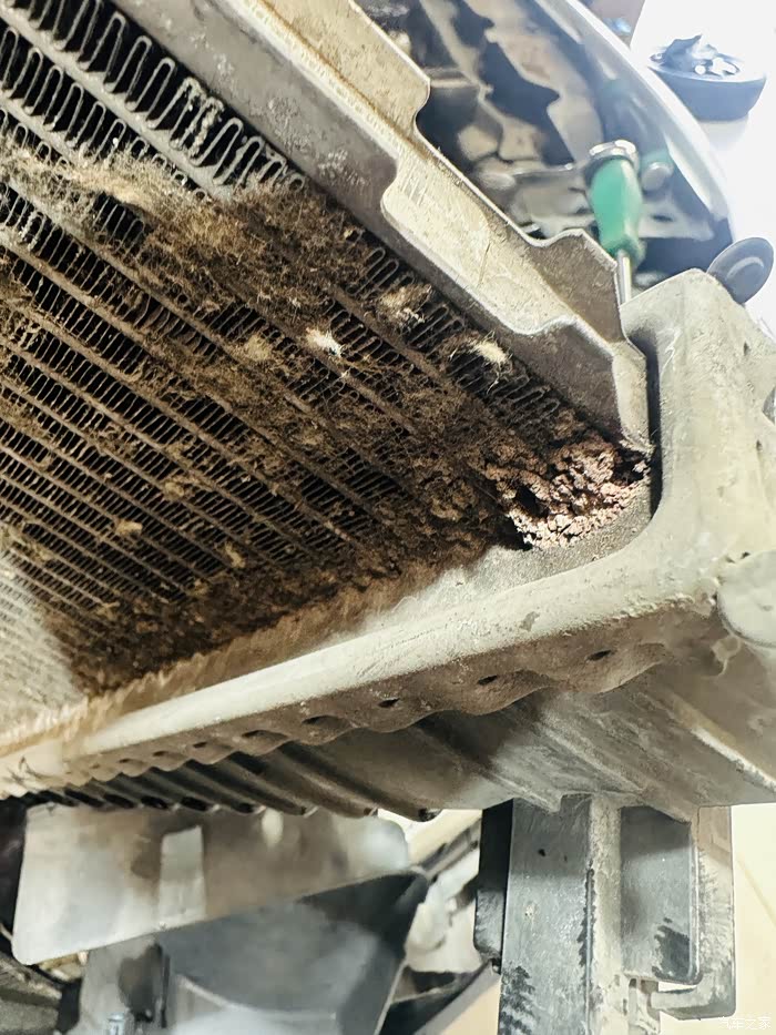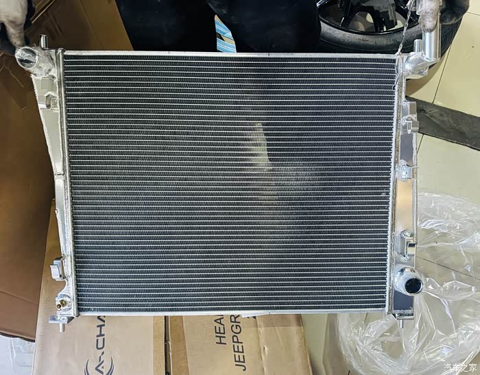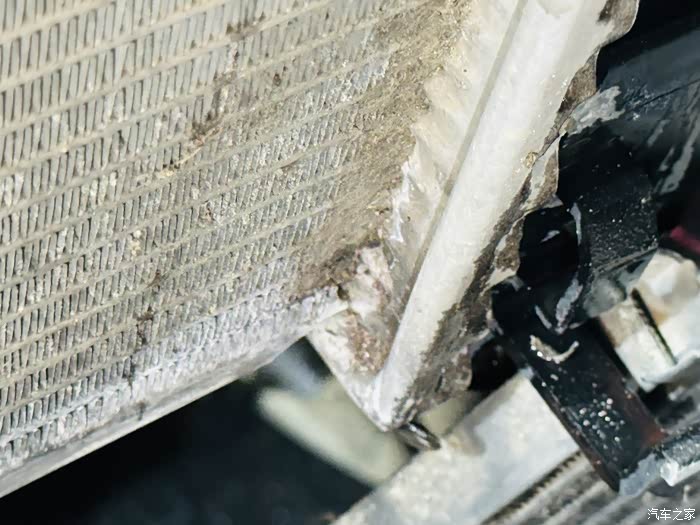 水箱不拆不知道,一层土。我这车开了快10年了,没清理过水箱。这回不用清理了,拆了换新的。新水箱的材质是全铝,还比原车的厚了一些。