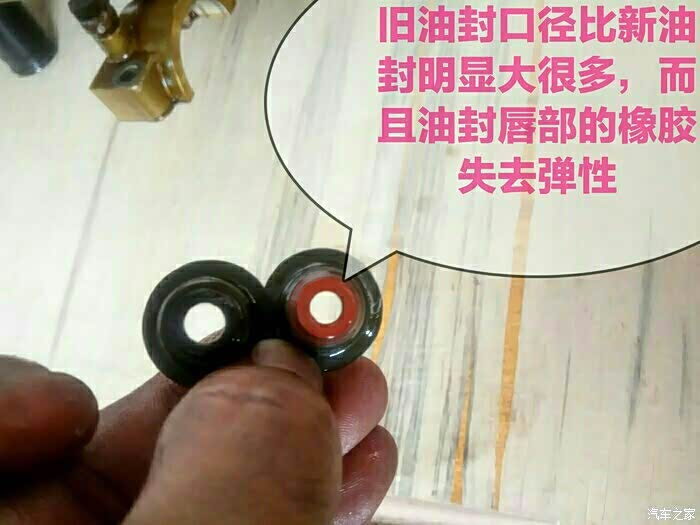 油封取出后和新油封进行了对比,发现油封口径明显变大,这就是烧机油的原因。