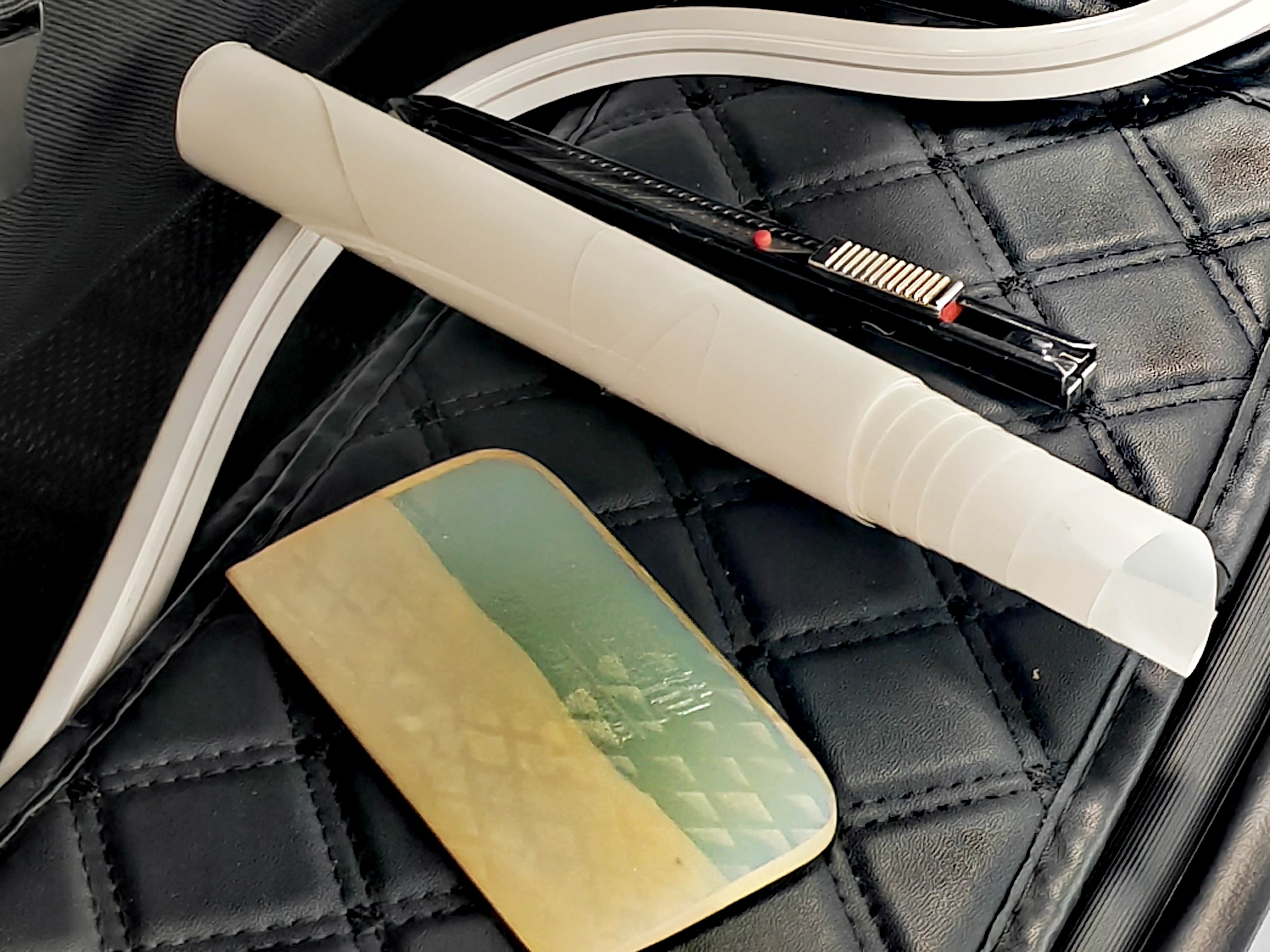 刮板,修复用的车衣,美工刀,这个可以说是贴车衣师傅的吃饭工具,必须好用。这里多提一嘴,师傅的刀工非常重要,曾经就有车友天窗周边生锈,吐槽说是车企问题,结果发现是贴膜时候,贴膜师傅刀工不行,刻刀破坏了漆面。